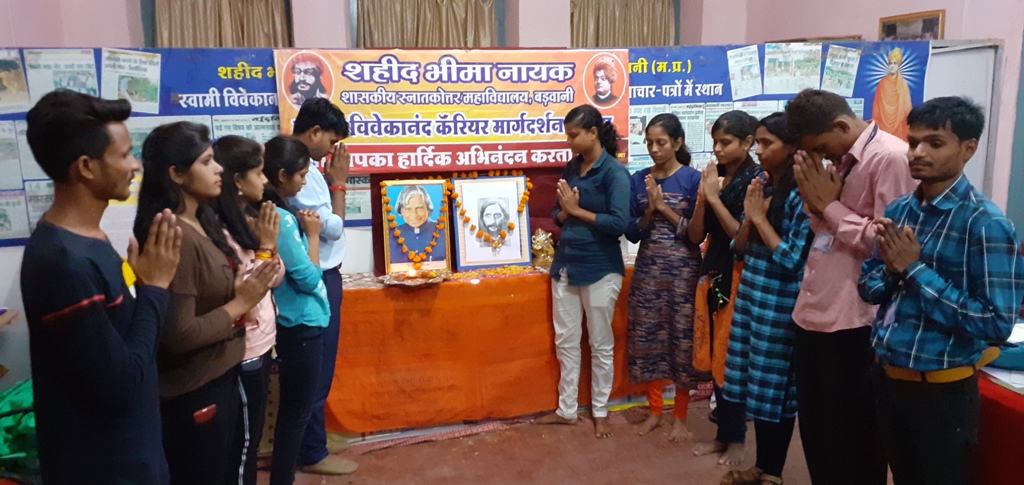 बड़वानी /शहीद भीमा नायक शासकीय स्नातकोत्तर महाविद्यालय, बड़वानी के स्वामी विवेकानंद कॅरियर मार्गदर्षन प्रकोष्ठ द्वारा आज प्राचार्य डाॅ. आर. एन. शुक्ल के मार्गदर्शन में सूर्यकान्त त्रिपाठी ‘निराला’ की 58 वीं पूण्यतिथि और डाॅ.एपीजे अब्दुल कलाम की 88 वीं जयंती के अवसर पर कार्यक्रम आयोजित किया गया। सर्वप्रथम दोनों विभूतियों के चित्रों का लाली वर्मा और ग्यानारायण शर्मा ने पूजन किया। ग्यानारायण शर्मा ने कहा कि दोनों व्यक्तित्वों के जीवन में अनेक प्रतिकूलताएं आईं, लेकिन वे उनसे हारे नहीं। उन्होंने टूटने की अपेक्षा जूझना पसंद किया और महान बने। इनके जीवन हमारे लिये प्रेरणा के स्रोत हैं।