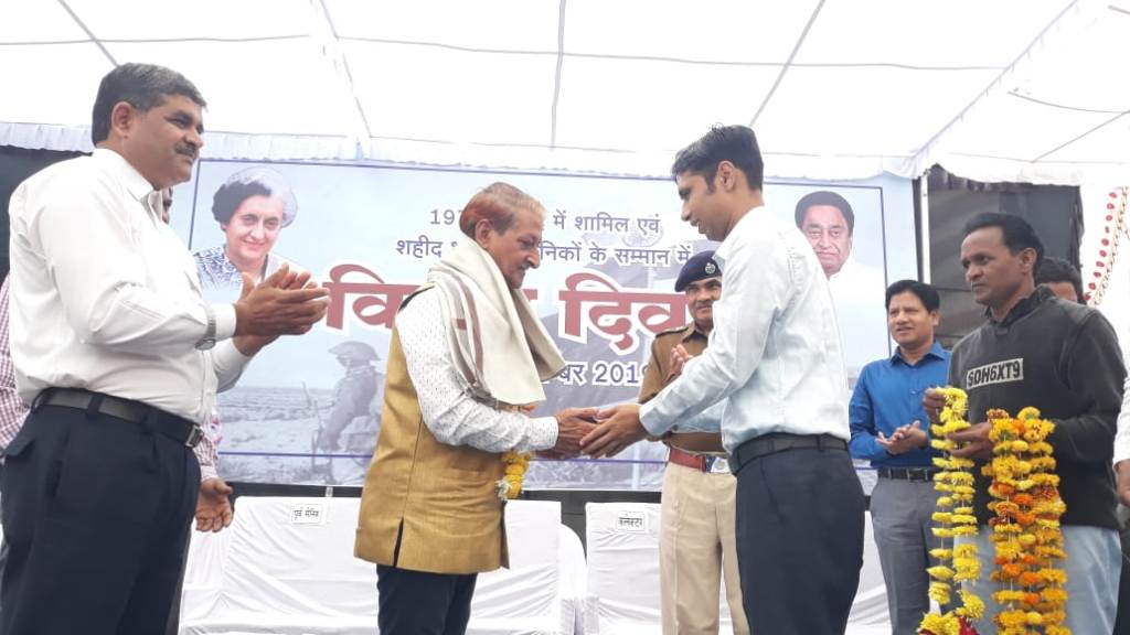 कार्यक्रम के दौरान कलेक्टर श्री अमित तोमर, नगर पालिका अध्यक्ष श्री लक्ष्मण चैहान, पुलिस अधीक्षक श्री डीआर तेनीवार एवं जिला पंचायत सीईओ श्री मनोज सरियाम ने 1971 के युद्ध में शामिल रिटायर्ड सूबेदार श्री राधेश्याम सोनी, रक्षा मेडल से सम्मानित श्री सीताराम सोनी, कारगिल युद्ध में शामिल सूबेदार श्री मुकेश डोंगरे तथा नायब सूबेदार श्री नंदकिशोर भार्गव का सम्मान शाल एवं श्रीफल देकर किया।