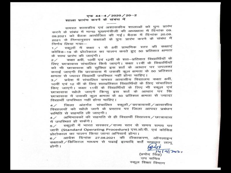 भोपाल । प्रदेश के सभी सरकारी और निजी स्कूलों में पहली से पांचवी तक की कक्षाएं 20 सितंबर से शुरू की जाएगी। स्कूल शिक्षा विभाग ने जारी किए निर्देश 50 उपस्थिति के साथ 20 सितंबर से पहली से पांचवी तक की कक्षाएं संचालित की जाएगी। आठवीं से बारहवीं तक के छात्रावास भी खोलें जाएंगे। मुख्यमंत्री शिवराज सिंह चौहान की अध्यक्षता में हुई बैठक में यह निर्णय हुआ है।