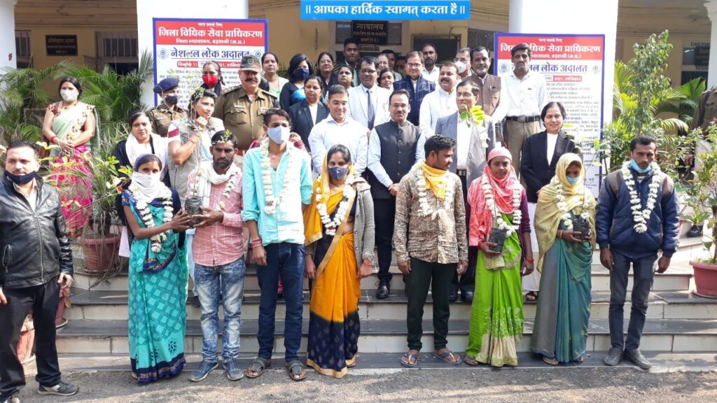 जिला न्यायालय परिसर बड़वानी में शनिवार को लगी नेशनल लोक अदालत में प्रधान जिला एवं सत्र न्यायाधीश श्री अजय कुमार गर्ग, कलेक्टर श्री शिवराजसिंह वर्मा, पुलिस अधीक्षक श्री दीपक कुमार शुक्ला तथा महिला हेल्प डेस्क के काउंसलरो की काॅउसलिंग से 4 दम्पतियों ने अपना मन-मुटाव दूर करते हुये पुनः एक दूसरे का हाथ थामकर एक साथ जीवन जीने की कसम खाई है। माता-पिता के इन पुर्नमिलन के साक्षी उनके अबौध बच्चे बने, वहीं न्यायाधीशों, प्रशासनिक अधिकारियों ने भी इन दम्पतियों को एक-एक फल का पौधा स्मृति बतौर भेंट किया है।