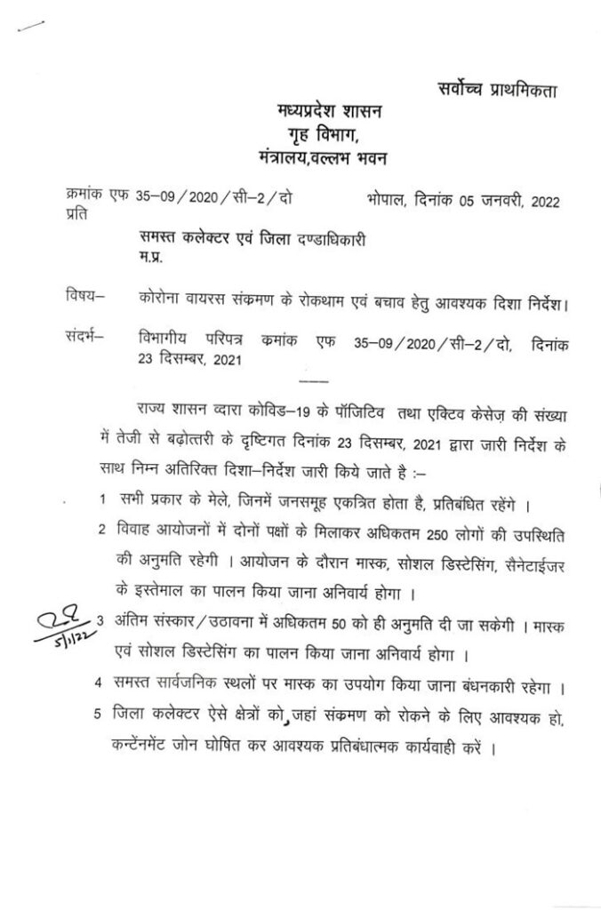 बुधवार को गृह विभाग के अपर मुख्य सचिव डा राजेश राजौरा ने कोरोना गाइडलाइन संबंधी नए निर्देश कलेक्टरों को जारी किए। इससे पहले मुख्यमंत्री शिवराज सिंह चौहान ने मंत्रालय में कोरोना की समीक्षा की। उन्होंने सभी कलेक्टरों से वीडियो कांफ्रेंसिंग के जरिए कोरोना संक्रमण की रोकथाम को लेकर किए जा रहे इंतजामों की जानकारी ली। ज्ञात हो कि प्रदेश में मंगलवार को 595 लोगों की रिपोर्ट पाजिटिव आई है।