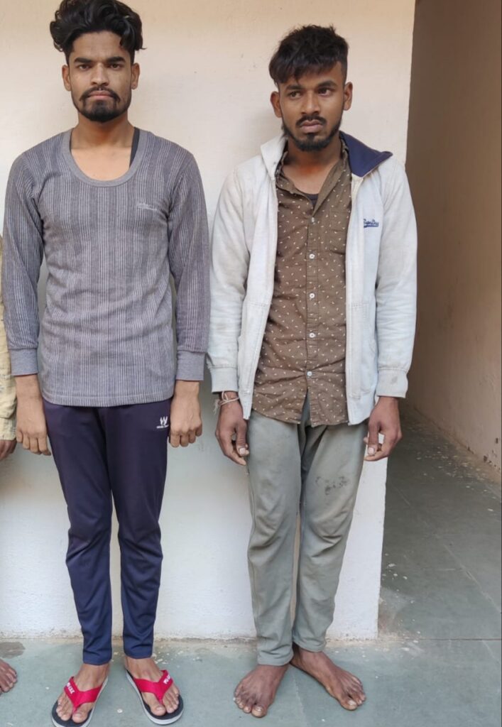 जिस पर राजपुर थाना प्रभारी श्री राजेश यादव स्वयं मय टीम के साथ पलसुद रोड़ नरावला फाटा राजपुर पहुंचे जहां पर दो टीम बनाकर एक टीम को बैकअप के लिये आगे भेजा जो एक टीम आगे जाकर छिप गई बाद चैकिंग के दौरान पलसुद रोड़ तरफ से एक पल्सर मोटर सायकल पर तीन व्यक्ति आते दिखे जो पुलिस को देखकर अचानक उनकी मोटर सायकल को वापस पलटाकर भागने लगे जिन्हे बैकअप के लिये छिपी टीम ने सामने से घेराबंदी कर दोनो टीमो तीनो व्यक्तियों को पकड़ा जिनका नाम पता पुछते एक ने अपना नाम 1. अनिल पिता सीताराम बड़ोले जाति भीलाला उम्र 25 वर्ष नि. मुंडियापुरा थाना अंजड़, 2. आकाश पिता दशरथ डावर जाति भीलाला उम्र 26 वर्ष नि. मंण्डवाड़ा थाना अंजड़, 3. एक नाबालिग 16 वर्ष का, होना बताये जिनके पास रखी थैलीयों को चैक कर तलाशी लेते अनिल बड़ोले के पास 05 पिस्टल व 05 खाली मैग्जिन मिली, आकाश डावर के पास 07 देशी कट्टे व 16 वर्ष के नाबालिग के पास से 03 देशी कट्टे मिले जो आरोपीयों के कब्जे से कुल 10 देशी कट्टे, 05 पिस्टल, 05 खाली मेंग्जिन, एक पल्सर मो.सा. व दो मोबाईल कुल किमती 2,80,000 रुपये के जप्त कर आरोपीयो व नाबालिग के विरुद्ध अपराध धारा 25(1)(a) आर्स एक्ट का अपराध पंजीबद्ध कर विवेचना में लिया गया। आरोपीयों से पुछताछ में उक्त हथियार पलसुद के सिकलीगर से लेकर सिंघाना के जगतसिंह को देने के लिये ले जाना बताया, जगतसिंह व सिकलीगर की तलाश कि जा रही है, आरोपीयों को न्यायालय पेश किया जावेगा।