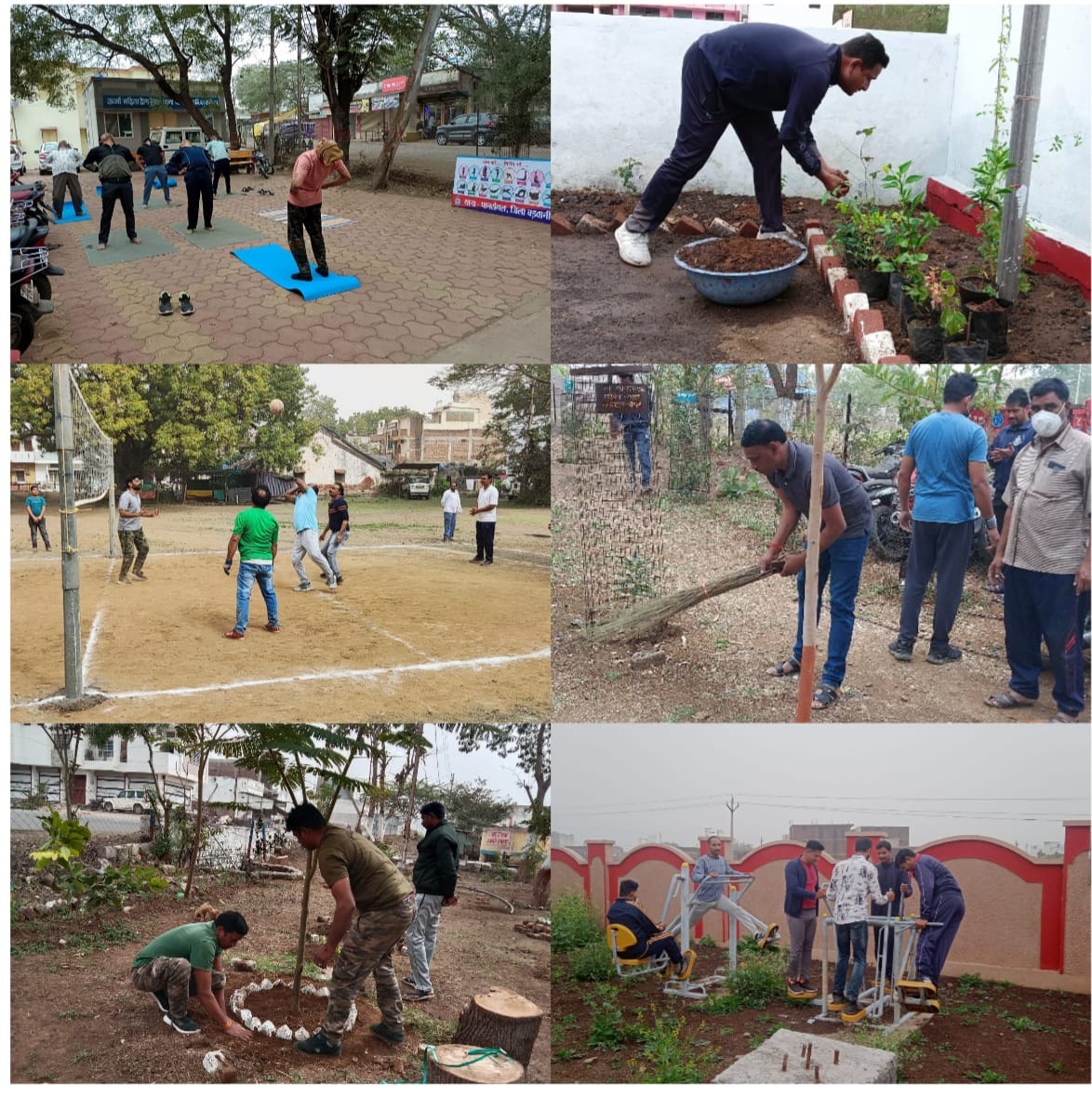 बड़वानी/ पुलिस अधीक्षक, श्री दीपक कुमार शुक्ला के निर्देशन एवं प्रेरणा से आज दिनांक 23.01.2022 रविवार को जिले के अलग-अलग थानों में पुलिस कर्मियों के बेहतर स्वास्थ्य , टीम भावना विकसित करने और तनाव से दूर रहने के लिये इकाई के समस्त थानों व चौकी पर प्रात:काल में योगा, प्रणायाम और शारीरिक व्यायाम का अभ्यास वर्ग चलाया गया । इसके अलावा खेल प्रेमी पुलिस अधिकारियों एवं कर्मचारियों के लिए बालीवाल, बेटमिटन आदि खेलकूद गतिविधियॉ एवं थाना परिसर के आस-पास सुरम्य वातावरण विकसित करने हेतु साफ-सफाई एवं थाने के संशाधनों का उचित रखरखाव हेतु टीम बिल्डिंग के साथ श्रमदान आदि गतिविधियो का आयोजन किया गया । योगा अभ्यास में कर्मचारियों को सूर्य नमस्कार शीर्षासन, सर्वागासन, चक्रासन, भुजंगासन, हलासन एवं तनाव को कम करने व रोगप्रतिरोधक क्षमता बढ़ाने हेतु हास्य योग करवाया गया।