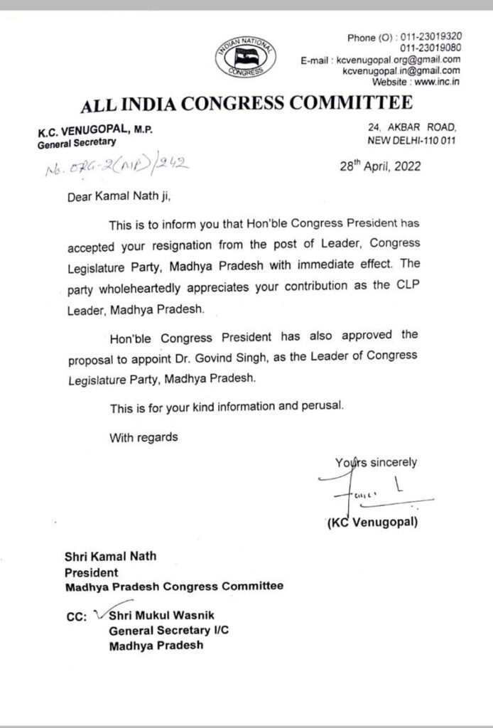 भोपाल। मध्यप्रदेश विधानसभा में कांग्रेस के वरिष्ठ विधायक और पूर्व मंत्री डॉक्टर गोविंद सिंह नेता प्रतिपक्ष होंगे । डॉक्टर गोविंद सिंह को कमल नाथ की जगह नेता नेता प्रतिपक्ष बनाया गया है। कमल नाथ अब तक प्रदेश अध्यक्ष के साथ नेता प्रतिपक्ष की दोहरी ज़िम्मेदारी निभा रहे थे। नाथ अब सिर्फ़ मध्य प्रदेश कांग्रेस के अध्यक्ष रहेंगे।