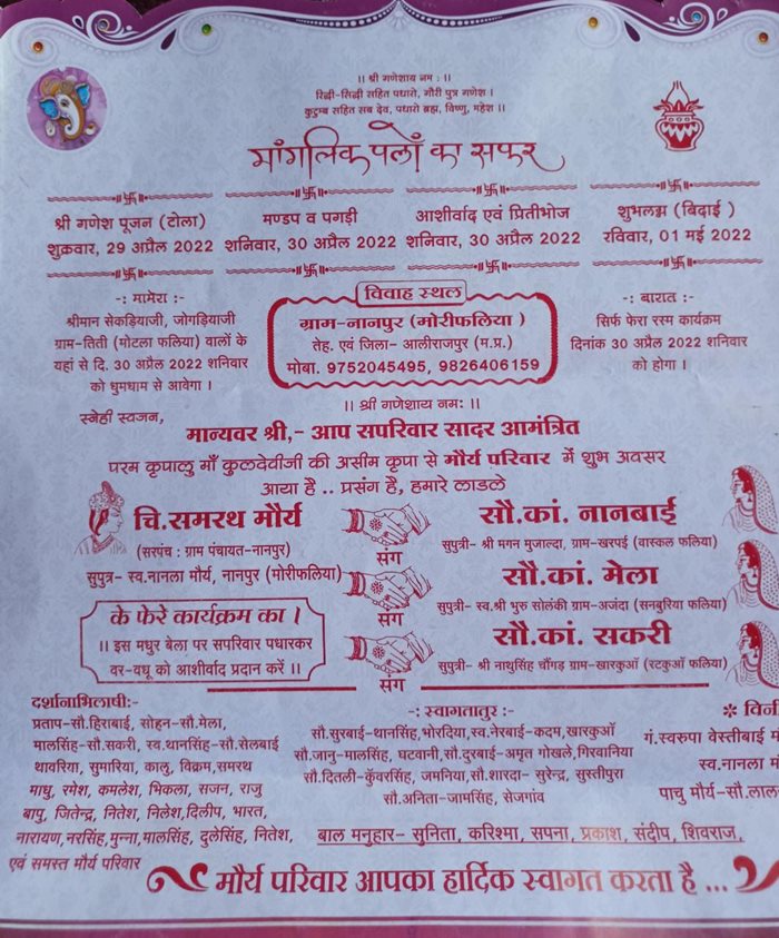 आदिवासी समाज की परंपर अनुसार कोई भी मांगलिक कार्य करने के लिए पति-पत्नी का रीति-रिवाज के अनुसार विवाह करना जरूरी है। इसलिए अब मौर्य ने तीनों महिलाओं के साथ रीति-रिवाज से ब्याह रचाया है। शादी समारोहपूर्वक हुई और इसके आमंत्रण पत्र भी बांटे गए। कार्ड में तीनों पत्नियों के नाम भी लिखे गए। शादी में आए लोगों के साथ मौर्य के छह बच्चों ने भी जमकर डांस किया। उनकी तीन पत्नियों से तीन पुत्री व तीन पुत्र हैं। बता दें कि भारतीय संविधान का अनुच्छेद 342 आदिवासी समाज की प्राचीन संस्कृति व रीति-रिवाज को संरक्षण प्रदान करता है।