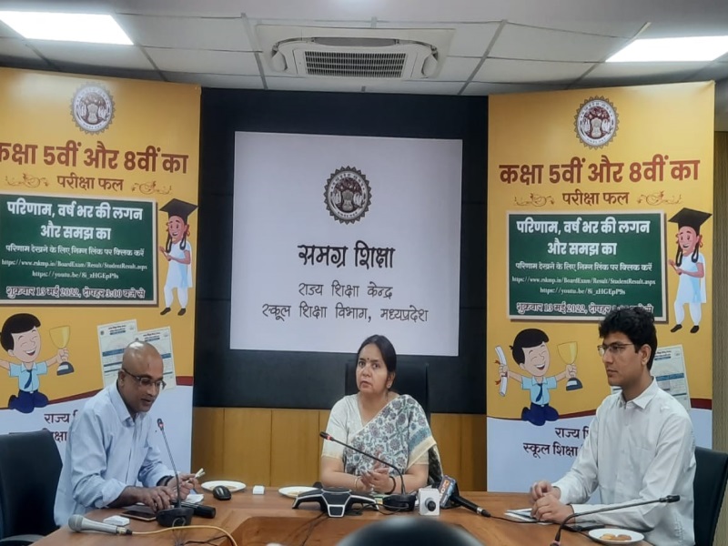 भोपाल। प्रदेश में माध्‍यमिक शिक्षा मंडल से संबद्ध सरकारी व निजी स्कूलों के पांचवीं व आठवीं कक्षा के परीक्षा परिणाम घोषित कर दिए गए। मप्र स्कूल शिक्षा विभाग की प्रमुख सचिव रश्मि अरूण शमी ने दोपहर तीन बजे राज्य शिक्षा केंद्र के सभाकक्ष में सिंगल क्लिक के माध्यम से परीक्षा परिणाम घोषित किया। दोनों कक्षाओं में करीब 15 लाख 83 हजार विद्यार्थी शामिल थे। इसमें बालिकाओं के पास होने का प्रतिशत 51.573 और बालकों का। 48.43 प्रतिशत है। पांचवीं का रिजल्ट 92.2 फीसद रहा। वहीं आठवीं में 89 फीसद बच्चों ने सफलता पाई है। पांचवी और आठवीं में जबलपुर संभाग का बेहतर रिजल्ट आया है। नरसिंहपुर जिले का सबसे बेहतर रिजल्ट 95.68 फीसद रहा। बता दें कि इस बार उत्तरपुस्तिकाओं का मूल्यांकन स्कूलों में ना कराकर संकुल केंद्रों पर कराया गया था।