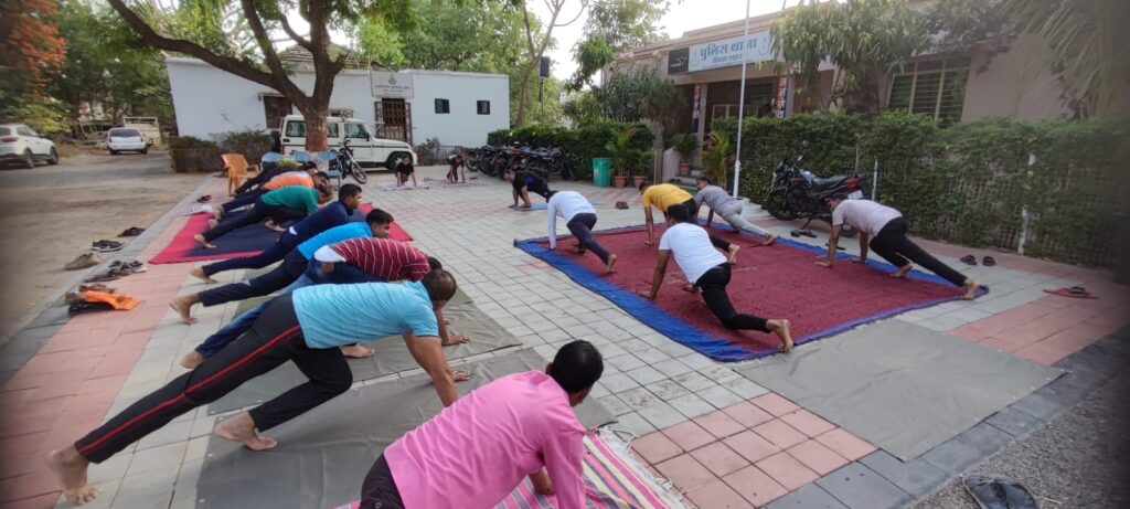 एस पी श्री दीपक कुमार शुक्ला के निर्देशन में सेंधवा शहर टी आई राजेश यादव ने अपने स्टाफ को आज सुबह 6:00 बजे योगाभ्यास कराया योगाभ्यास के दौरान सूर्य नमस्कार, सर्वांगासन, हलासन, भुजंगासन धनुरासन शलभासन वज्रासन उत्तानपादासन भस्त्रिका , शीतली प्राणायाम कराया और कौन सी बीमारी में कौन सा योगासन सहायक होगा इसके बारे में जानकारी दी, स्टाफ को खानपान में सुधार कर समय से भोजन करना ,समय से सोना, साल में दो बार अपना फिजिकल चेकअप कराने की सलाह दी राजेश यादव ने बताया कि थाने में योगासन गतिविधियां जारी रहेगी