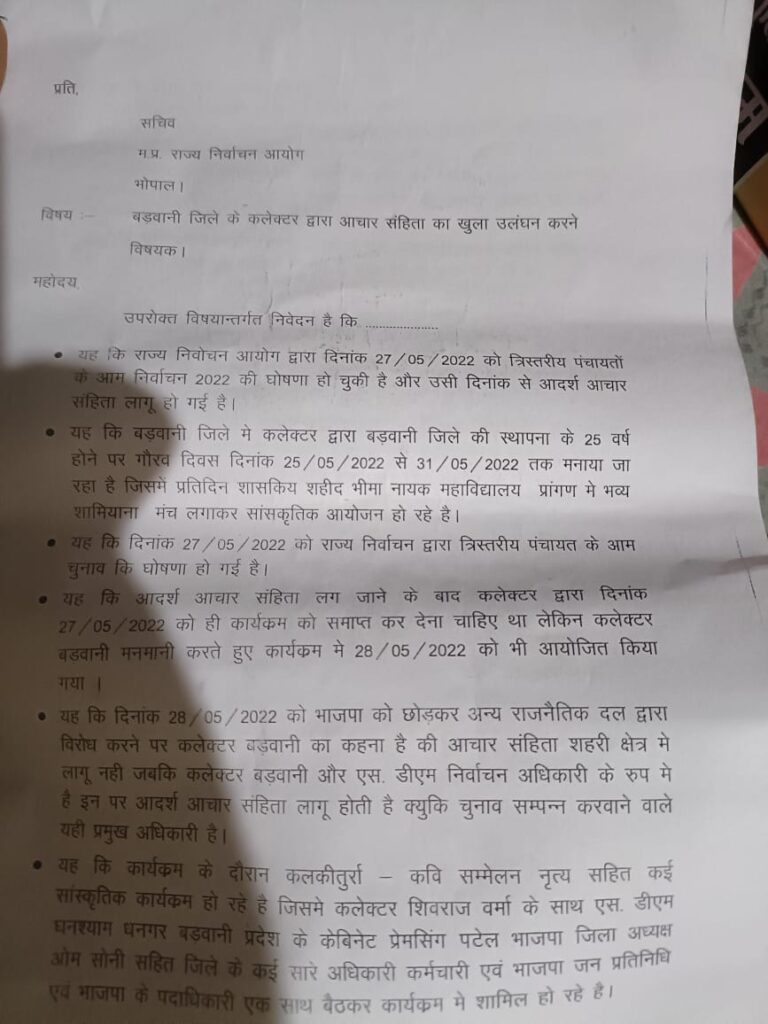 चर्चा है कि बड़वानी गौरव महोत्सव के तहत काग्रेस नेता राजन मंडलोई ने कलेक्टर और sdm को तत्काल हटाने की मांग निर्वाचन आयोग से की थी।