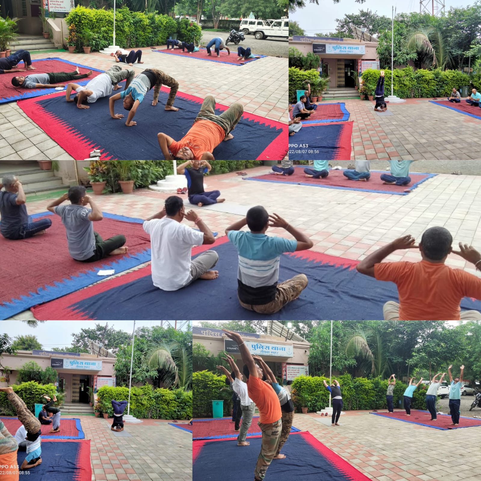 आदि को देखते हुए टीआई राजेश यादव के द्वारा थाना परिसर में समस्त स्टाफ को योगासन प्राणायाम के साथ ही फिजिकल एक्सरसाइज करवाई गई। जिससे फोर्स शारीरिक मानसिक रूप से स्वस्थ रहें। और अपनी ड्यूटी को मुस्तैदी से कर सके। टी आई राजेश यादव के द्वारा स्टाफ को सूर्य नमस्कार, सर्वांगासन, शीर्षासन, हलासन, धनुरासन, भुजंगासन चक्रासन वज्रासन सहित भ्रामरी प्राणायाम, अनुलोम विलोम भस्त्रिका प्राणायाम के साथ ही सम्मोहन की विधि बताकर चेतन और अवचेतन मन की शक्तियों से भी अवगत कराया।
