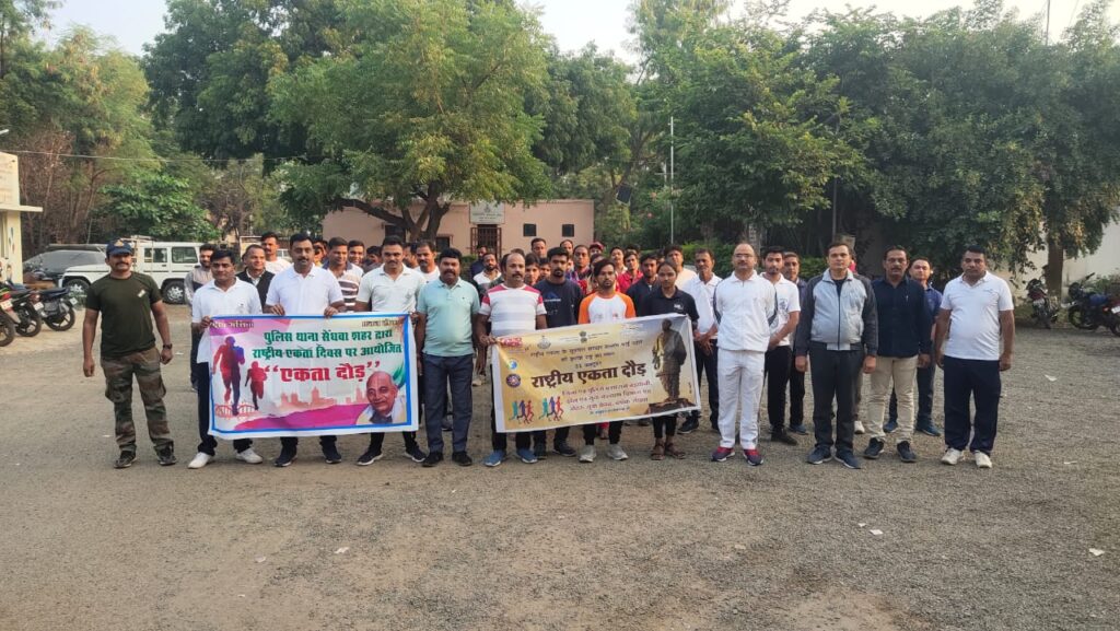 सेंधवा / 31 अक्टूबर राष्ट्रीय एकता दिवस पर  भारत के प्रथम उप प्रधानमंत्री एवं प्रथम गृहमंत्री, लोह पुरुष सरदार वल्लभभाई पटेल के जन्मदिवस पर पुलिस थाना सेंधवा शहर के द्वारा एसपी श्री दीपक कुमार शुक्ला के निर्देशन एवं एसडीओपी श्री कुंदन मंडलोई के मार्गदर्शन में टीआई सेंधवा सिटी राजेश यादव द्वारा एक एकता दौड़ का आयोजन किया गया। दौड़ में थाना सेंधवा सिटी टी आई राजेश यादव एवं उनका स्टाफ, एसडीओपी आफिस स्टाफ, नगर पालिका सीएमओ श्री कमलेश पाटीदार एवं उनका स्टाफ, नेहरू युवा केंद्र से रविन्द्र निगवाले, शर्मिला सस्तिया और उनकी टीम ,एनसीसी से ग्रुप लीडर  जयेश बारेला और उनकी प्लाटून एवं एनएसएस, ग्राम रक्षा समिति से ललित तिवारी,मनोज  पालिवाल एवम अन्य सदस्य शामिल हुए। एकता दौड़ थाना परिसर से प्रारंभ होते हुए किला रोड होकर मौसम चौराहा संत विनोबा भावे मार्ग होते हुए मुख्य ए बी रोड से थाना परिसर पहुंचकर समाप्त हुई ।