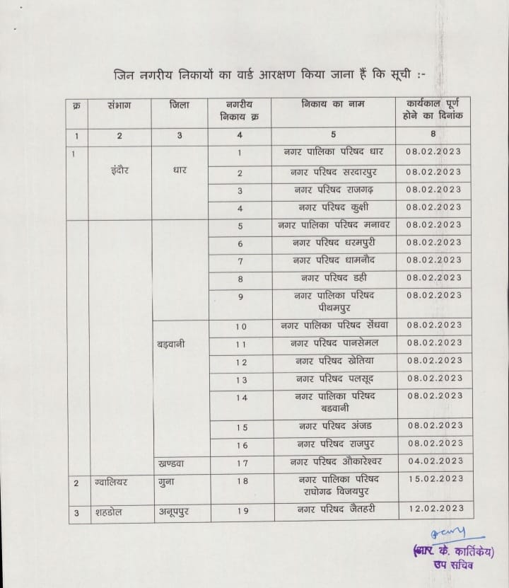 ज्ञात हो कि प्रदेश की 19 नगरीय निकायों का कार्यकाल जनवरी-फरवरी 2023 में पूर्ण हो जाऐगा। इसमें बड़वानी जिले की की 2 नगर पालिका परिषद और 5 नगर परिषद का कार्यकाल भी 8 फरवरी 2023 को पूर्ण हो रहा है। इसी को लेकर मध्यप्रदेश शासन नगरीय विकास एवं आवास विभाग मंत्रालय भोपाल व्दारा प्रदेश की 19 नगरीय निकाय जिनमें धार, बड़वानी, खण्डवा, गुना एवं अनूपपुर जिला शामिल है के लिए वार्ड आरक्षण के लिए समय-सारणी निर्धारित की है। ताकि 19 नगरीय निकाय के निर्वाचन समय पर सम्पन्न हो जाऐ। ज्ञात हो कि जिले में पिछले चुनाव का मतदान 17 जनवरी 2018 को सम्पन्न हुआ थे तथा वोटो की गिनती 20 जनवरी 2018 को हुई थी। नगरपालिका चुनाव की आचार सहिता 27 दिसम्बर 2017 को लागू हो गई थी तथा नामांकन प्रक्रिया 27 दिसम्बर से। इस तरह से नगरपालिका परिषद के निर्वाचन की उल्टी गिनती शुरु हो गई है। जो कि जनवरी-फरवरी 2023 में होना प्रस्तावित है। उक्त नगरपालिका चुनाव 2023 में साल के अंत में होने वाले विधान सभा चुनाव की दशा और दिशा तय करेंगे। वर्ष 2018 के बड़वानी नगरपालिका चुनाव में कांग्रेस के लक्ष्मण चैहान ने 2598 मतो से जीत दर्ज करवाई थी। साथ ही एक-एक, भाजपा-कांग्रेस समर्थित प्रत्याशी निर्विरोध जीते थंे। शेष 22 पार्षदों के निर्वाचन सम्पन्न हुए थे जिसमें 12 कांग्रेस समर्थित तो 10 भाजपा समर्थित प्रत्याशियों ने अपनी जीत दर्ज करवाई थी। जिसके चलते कांग्रेय समर्थित परिषद बनी थी।