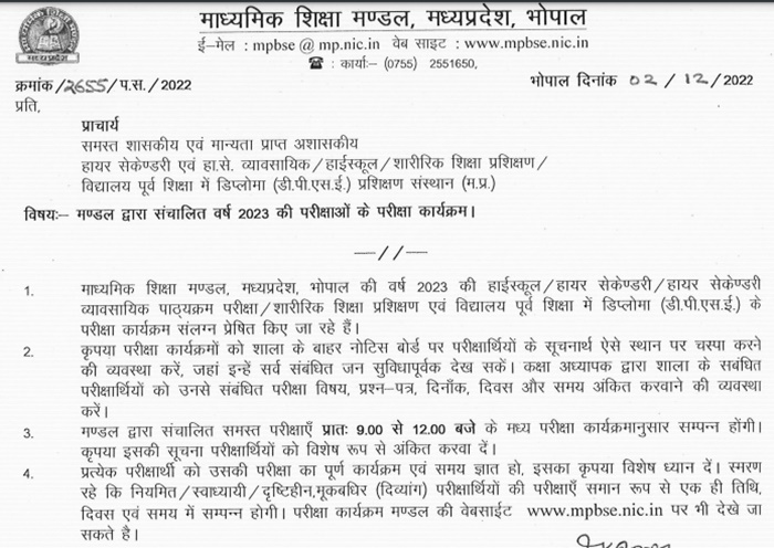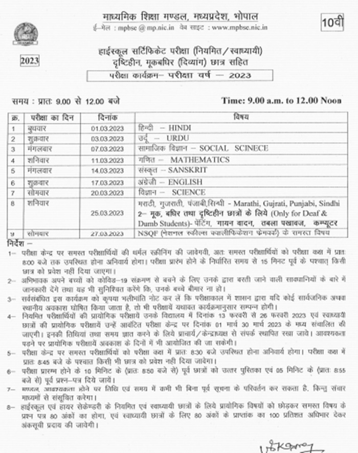 भोपाल /  माध्‍यमिक शिक्षा मंडल (माशिम) ने शिक्षा सत्र 2022-23 की दसवीं व बारहवीं बोर्ड परीक्षा की समय सारणी शुक्रवार को घोषित कर दी है। कक्षा दसवीं की परीक्षाएं एक मार्च और बारहवीं की परीक्षाएं दो मार्च से शुरू होंगी। दोनों ही कक्षाओं की परीक्षा समय सुबह नौ बजे से 12 बजे तक रहेगा और पहला पेपर हिंदी का होगा।
