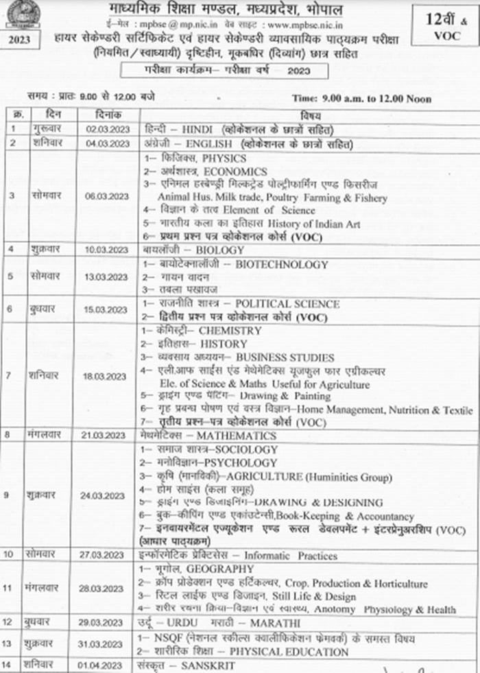 बारहवीं बोर्ड परीक्षा की समय सारिणी