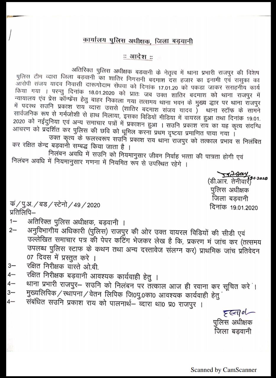 बड़वानी(रेवा की पुकार) अतिरिक्त पुलिस अधीक्षक बड़वानी सुनिता रावत के नेतृत्व में थाना प्रभारी राजपुर अनिल बामनिया की विशेष टीम व्दारा जिला बड़वानी का शातिर बदमाश दस हजार का इनामी एवं रासुका का आरोपी संजय यादव निवासी दारुगोदाम सेंधवा को शुक्रवार दिनांक 17.1.2020 को पकड़ा जाकर सराहनीय कार्य किया। परन्तु दिनांक 18.1.2020 को प्रातः जब उक्त शातिर बदमाश को राजपुर थाने से न्यायालय एवं प्रेस काॅन्फ्रेंस हेतु बाहर निकाला गया तो उस समय थाना भवन राजपुर के मुख्य द्धार पर पदस्थ सउनिरीक्षक प्रकाश राय व्दारा अपराधी संजय यादव से थाना स्टाफॅ के सामने सार्वजनिक रुप से गर्मजोशी के साथ हाथ मिलाया। जिसका विडियों वायरल होने तथा अखबारों में समाचार प्रमुखता से प्रकाशित होने पर पुलिस अधीक्षक श्री डीआर तेनीवार के व्दारा सउनि प्रकाश राय के कृत्य को संदिग्ध आचरण को प्रर्दशित कर पुलिस की छबि को धूमिल करना मानते हुए सउनि प्रकाश राय को तत्काल प्रभाव से निलंबित कर रक्षित केन्द्र बड़वानी अटेच कर दिया।