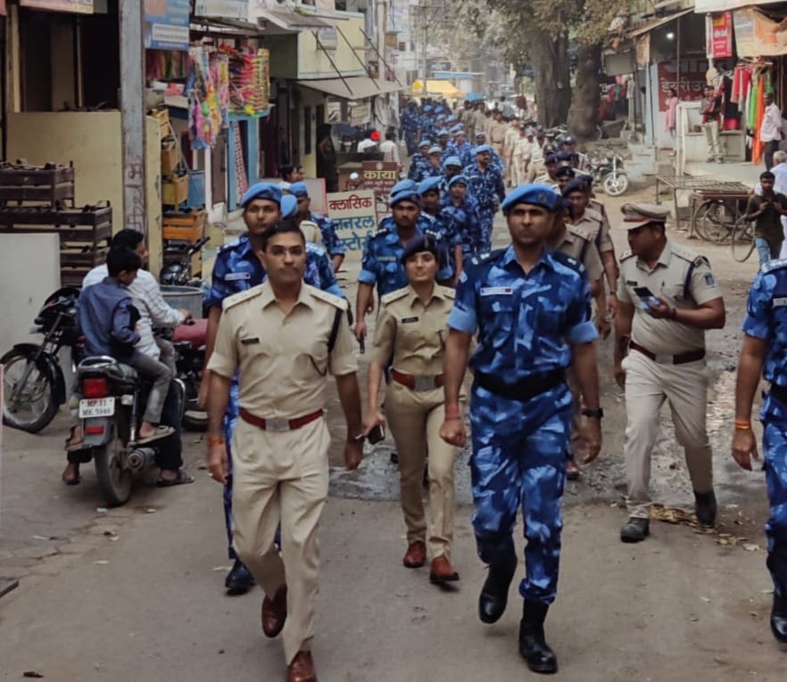 बड़वानी / पुलिस अधीक्षक, श्री दीपक कुमार शुक्ला के नेतृत्व में में रेपिड एक्सन फोर्स के 72 सदस्यी दल व जिला पुलिस बल ने कस्बा शहर बड़वानी में किया फ्लेग मार्च किया। पुलिस अधीक्षक महोदय ने बताया कि बड़वानी जिले के कई कस्बे संवेदनशील है कानून व्यंवस्था की दृष्टि से सम्प्रदायिक चुनोतियों की दृष्टि से इससे निपटने के लिये जिले में दिनांक 25.02.23 से आर0ए0एफ0 (रेपिड एक्सन फोर्स ) की एक यूनिट परिचय अभ्यास के लिये आई हुई है । इनका मूल उददेश्यं है बड़वानी जिले के बारे में जानकारी एकत्रित करना कौन से संवेदन शील क्षेत्र है, कौन से मिक्स पोपुलेशन वाले क्षेत्र है । विगत वर्षो में कहा पर ऐसी घटनाएं हुई है ओर इस तरह से भविष्य में कोई आपात स्थिति निर्मित होती है तो उससे किस तरह बेहतर आपसी सामान्य् व नॉलेज के तरीके से निपटा जा सके । अब तक जिले में सेंधवा, अंजड़, ठीकरी, पलसूद, राजपुर आदि कस्बे कवर कर चुके है। इसी कड़ी में दिनांक 03.03.23 को बड़वानी शहर में फ्लेग मार्च पुलिस अधीक्षक महोदय के नेतृत्व में किया गया । आर0ए0एफ0 (रेपिड एक्स0न फोर्स ) की युनिट को बड़वानी शहर के संबंध में परिचय दिया गया । साथ ही वर्तमान में भगौरिया व आगामी आने वाले त्यौहार होली, धुलंडी, शबे ए बारात, रंग पंचमी, राम नवमी, रमजान आदि त्यौहारो को देखते हुए तैयारी भी की गई फ्लेग मार्च किया गया । सुरक्षा व सदभावना का संदेश दिया गया और किसी भी परिस्थिति से निपटने के लिये हमारा पुलिस बल सक्षम है । पुलिस अधीक्षक महोदय ने सभी से शांति की अपील करते है और खुशी- सौहार्द के माहोल में त्यौहार मनाने की अपील की है ।