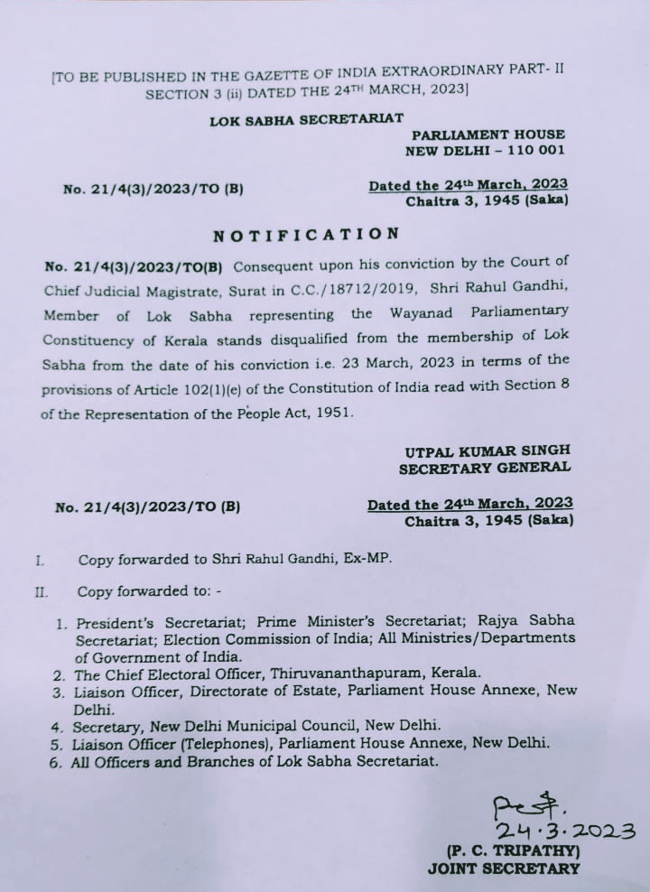 कांग्रेस नेता राहुल गांधी को बड़ा झटका लगा है। मानहानि केस में कोर्ट से मिली दो साल की सजा के बाद राहुल गांधी की संसद सदस्यता खत्म कर दी गई। राहुल गांधी अब 8 साल तक चुनाव नहीं लड़ पाएंगे। आपको बता दें कि सूरत की स्थानीय कोर्ट ने 4 साल पुराने आपराधिक मानहानि के मामले में 2 साल की सजा सुनाई थी, साथ ही राहुल गांधी पर 15 हजार रुपए का जुर्माना भी लगाया था। हालांकि सूरत की स्थानीय कोर्ट ने राहुल गांधी की सजा को 30 दिन के लिए स्थगित कर दिया है।