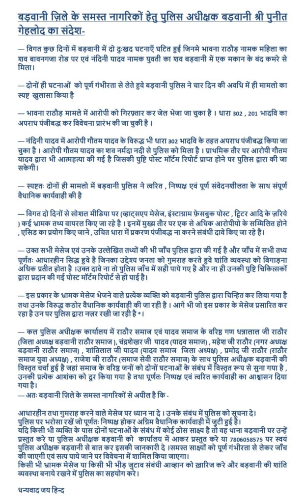 आधारहीन तथा गुमराह करने वाले मेसेज पर ध्यान ना दे । उनके संबंध में पुलिस को सूचना दे। पुलिस पर भरोसा रखें जो पूर्णतः निष्पक्ष होकर अग्रिम वैधानिक कार्यवाही में जुटी हुई है। यदि किसी भी व्यक्ति के पास दोनों घटनाओं के संबंध में कोई ठोस साक्ष्य है तो वह थाना बड़वानी पर उन्हें प्रस्तुत करे या पुलिस अधीक्षक बड़वानी को कार्यालय में आकर प्रस्तुत करे या 7806058575 पर स्वयं पुलिस अधीक्षक बड़वानी से बात कर इसकी जानकारी दे ।समस्त साक्ष्यों को पूर्ण गंभीरता से लेकर जाँच की जाएगी एवं सत्य पाये जाने पर विवेचना में शामिल किया जाएगा। किसी भी भ्रामक मेसेज या किसी भी भीड़ जुटाव संबंधी आव्हान को ख़ारिज करे और बड़वानी की शांति व्यवस्था बनाये रखने में पुलिस का सहयोग करे।