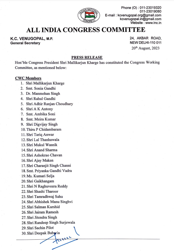 नई दिल्ली / इस साल होने वाले विधानसभा चुनावों के साथ ही अगले साल के आम चुनावों (Lok Sabha Chunav 2024) को देखते हुए कांग्रेस ने अपनी नई वर्किंग कमेटी (CWC) गठित की है। नई कांग्रेस वर्किंग कमेटी में शामिल नेताओं की लिस्ट पार्टी के राष्ट्रीय अध्यक्ष मल्लिकार्जुन खरगे ने जारी की।