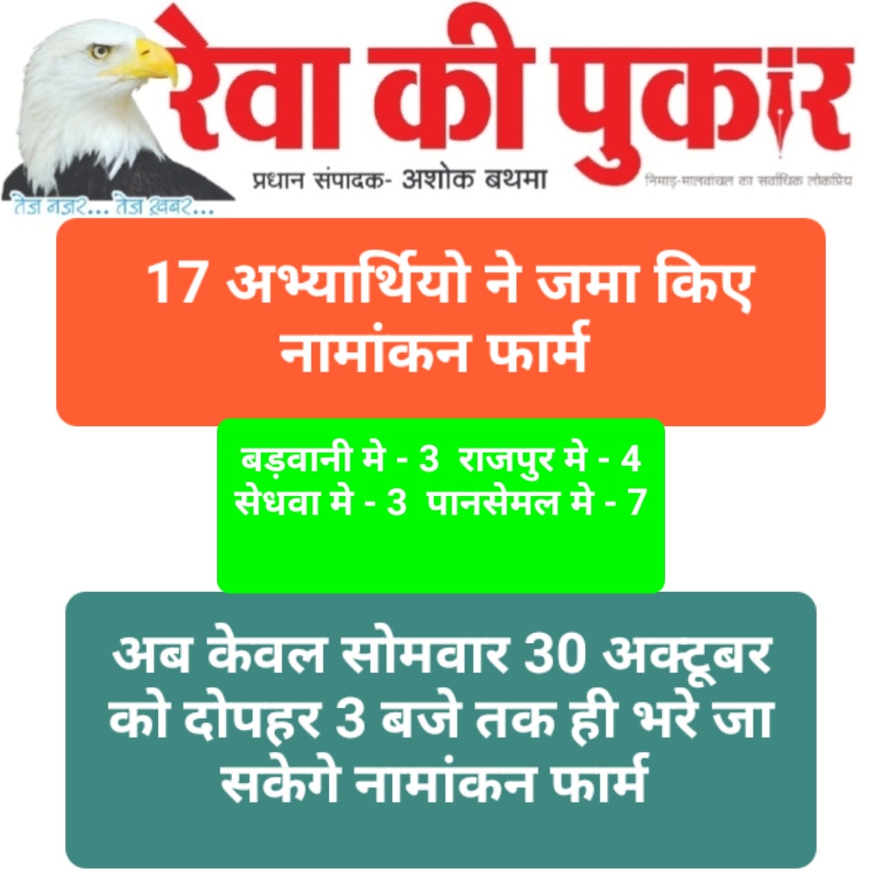 बड़वानी/ अब केवल सोमवार 30 अक्टूबर को 3 बजे तक ही भरे जा सकेगे नामांकन फार्म। अभी तक कुल 17 अभ्यार्थियों ने अपने नामांकन पत्र दाखि कराये है। जिनमें बड़वानी विधान सभा से 3, राजपुर से 4, संेधवा से 3 और पानसेमल से 7 अभ्यार्थियों ने नामांकन पत्र अभी तक जमा कराये है। आज और कल अवकाश है इसलिए नामांकन फार्म जमा नही हो सकेगे। 30 अक्टूबर नामांकन पत्र जमा करने की अन्तिम तिथि है इस दिन केवल 3 बजे तक ही फार्म जमा हो सकेगे। 31 अक्टूबर को नामांकन पत्रों की जाॅच होगी उसके बाद 2 नवम्बर तक नाम वापसी का सिलसिला चलेगा। 17 नवम्बर को मतदान तथा 3 दिसम्बर को वोटो की गिनती होगी।