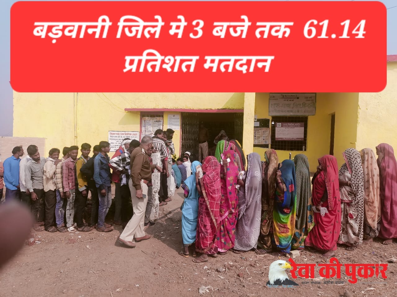 बड़वानी / मध्यप्रदेश की भावी सरकार बनाने के लिए आज मतदान किया जा रहा है। अब मतदाताओं के लिए केवल 2 घण्टे का मतदान करने का समय शेष बचा है। आपके लोकप्रिय अखबार ‘‘रेवा की पुकार’’ की जिन मतदाताओं ने अभी तक अपने मताधिकार का उपयोग नही किया है उन सभी से विनम्र अपील है कि समय निकाल कर मतदान जरुर करें। दोपहर 3 बजे तक जिले में 61.14 प्रतिशत मतदान हुआ है जिसमें सबसे कम बड़वानी में 57 प्रतिशत वोट डले है जबकि अभी तक सबसे अधिक मतदान राजपुर में 65.29 प्रतिशत हो चुका है। पानसेमल में 62.43 प्रतिशत और सेंधवा में 60.51 प्रतिशत वोट डल चुके है। गौरतलब हो कि वर्ष विगत 2018 में मतदाताओ की संख्या 9 लाख 21 हजार 7 सौ 3 थी जो बड़कर इस बार 10 लाख 71 हजार 1 सौ 17 हो गई है यनिकी इस बार 1 लाख 49 हजार 4 सौ 14 मतदाताओं की वृद्धि हुई है।