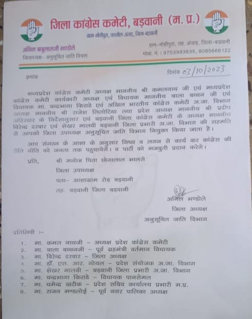 बड़वानी / मध्यप्रदेश कांग्रेस कमेटी अध्यक्ष श्री कमलनाथ, प्रदेश कांग्रेस कमेटी के कार्यकारी अध्यक्ष व विधायक श्री बाला बच्चन, विधायक सुश्री चन्द्रभागा किराड़े, भारतीय कांग्रेस कमेटी अ.जा.विभाग अध्यक्ष श्री राजेश सिलोटिया तथा प्रदेश अध्यक्ष श्री प्रदीप अहिरवार के निर्देशानुसार बड़वानी कांग्रेस कमेटी अध्यक्ष श्री विरेन्द्र दरबार एवं श्री शेखर मालवी बड़वानी जिला प्रभारी अ.जा. विभाग की सहमति से जिला अध्यक्ष श्री अनिल भण्डोले अनुसूचित जाति विभाग व्दारा श्री मनोज भालसे को जिला उपाध्यक्ष नियुक्त किया गया है।
