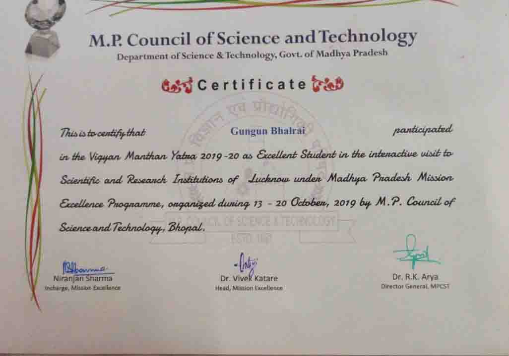बड़वानी/ पुष्पकुॅंज विधा मंदिरा बड़वानी की छात्रा कु. गुनगुन हुकुमकुमार भलराय, का म.प्र. विज्ञान एवं प्रौधोगिकी परिषद भोपाल व्दारा विज्ञान मंथन या़त्रा के लिए चयन किया गया है। विज्ञान मंथन यात्रा में कक्षा 8 वीं के चयनित विधार्थियों को लखनऊ स्थित वैज्ञानिक संस्थानों,राष्ट्रीय प्रयोगशालाओं,तारामंडल इत्यादि का एक सप्ताह तक भ्रमण कराया गया। देश के ख्यातनाम वैज्ञानिकों के व्दारा विभिन्न विषयों पर व्याख्यान दिये गये । विज्ञान मंथन यात्रा के अंत में भोपाल पहॅंुचने पर स्कालरशिप टेस्ट आयोजित किया गया । इस टेस्ट में मध्यप्रदेश के कक्षा 8 वीं के 20 छात्र-छात्राओं का चयन किया गया है। जिसमें बड़वानी जिले से पुष्पकॅुज विधा मंदिर की कक्षा 8 वीं की छात्रा गुनगुन का भी चयन हुआ। कु. गुनगुन को इस गौरवशाली उपलब्धि पर म.प्र. विज्ञान एपं प्रौधोगिकी परिषद व्दारा 3000/-(तीन हजार रुपये) प्रतिमाह की स्कालरशिप प्रदान की गई है। इस महती उपलब्धि पर विधालय के शिक्षकों व्दारा हर्ष व्यक्त किया गया है, साथ ही संस्था के प्राचार्य माधव खण्डेलवाल के व्दारा प्रसन्नता व्यक्त करते हुए कु. गुनगुन के उज्जवल भविष्य की कामना की।