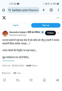 बीजेपी प्रवक्ता नरेंद्र सलूजा ने सोशल मीडिया एक्स (X) पर लिखा है कि- व्यापमं मामले में कई माह जेल में रहे व्यक्ति को प्रदेश अध्यक्ष जीतू पटवारी ने बड़वानी जिला कांग्रेस का अध्यक्ष बनाया है। उन्होंने नानेश चौधरी की नियुक्ति पर उठे राजनीतिक बवाल पर निशाना साधा है। कहा कि- बड़वानी जिला अध्यक्ष की नियुक्ति का खुद कांग्रेसजन विरोध कर रहे है