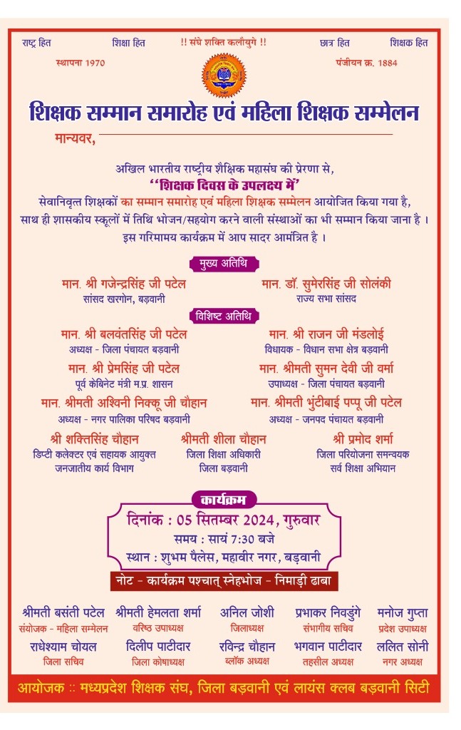 इस कार्यक्रम के मुख्य अतिथि सांसद श्री गजेन्द्र सिंह पटेल,dr सुमेर सिंह सोलंकी,विधायक राजन मंडलोई,जिला पंचायत अध्यक्ष बलवंत सिंह पटेल, पूर्व मंत्री प्रेम सिंह जी पटेल के विशेष आतिथ्य में स्थानीय शुभम पैलेस बड़वानी में शाम 7.30 बजे आयोजित किया है। इस गरिमामय कार्यक्रम में शिक्षको के साथ साथ ऐसी संस्थाओं तथा व्यक्तियों का भी सम्मान किया जाएगा जो शासकीय स्कूलों में बच्चो को तिथि भोजन कराने हेतु स्कूलों को गोद लिया है,तथा शिक्षण सामग्री,निर्माण सामग्री भेंट की है।