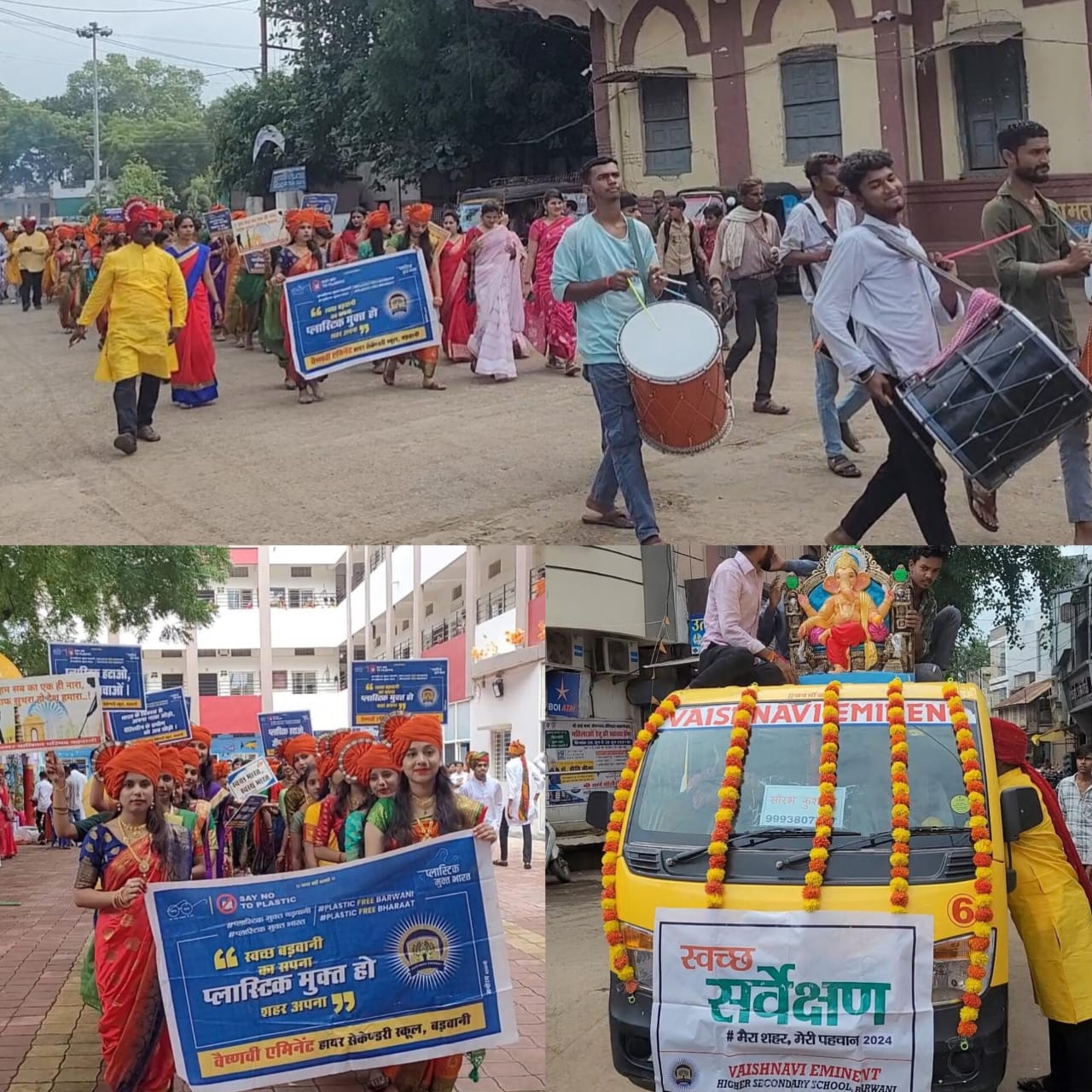 बडवानी / प्रतिवर्षानुसार इस वर्ष भी शहर की वैष्णवी एमिनेंट स्कूल द्वारा धूमधाम से गणेश जी की स्थापना की गई। शनिवार को स्कूली बच्चें एवं शिक्षक-शिक्षिकाएं ढोल-ताशों के साथ हर्षोल्लास से गणेश जी की प्रतिमा लेने शहर के रणजीत चौक पहुंचे। इससे पूर्व स्कूल के जुलूस के रूप में निकले विद्यार्थी एवं शिक्षकों ने शहरवासियों को जागरूक किया गया। शहर के मुख्य मार्गों से गुजरते हुए बच्चों द्वारा स्वच्छता और पॉलीथिन मुक्त हो शहर का संदेश दिया गया। बच्चें अपने हाथों में जागरूकता के संदेश लिखी तख्तियां लिए चल रहे थे।