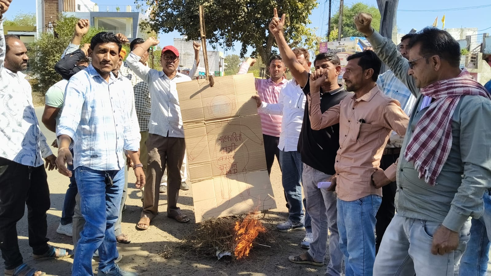 बड़वानी / आज गुरूवार को दोपहर 2 बजे के दरमियान राष्ट्रीय किसान मजदूर महासंघ जिला ईकाई द्वारा जिला सहकारी केन्द्रीय बैंक के एमडी का पुतला दहन किया गया। दरअसल आज स्थानीय सेगांवा हनुमान मंदिर में संगठन की मासिक बैठक का आयोजन किया गया जिसके उपरांत अपनी समस्याओं को लेकर संगठन जिलाध्यक्ष मदन मुलेवा के नेतृत्व में कलेक्ट्रेट पहुंचकर कलेक्टर को अपनी समस्याओं के निराकरण की मांग को लेकर एक ज्ञापन सौंपा गया, इस दौरान कलेक्टर कार्यालय पहुंचे बड़वानी विधायक राजन मंडलोई को भी एक ज्ञापन देकर संघ पदाधिकारियों ने अवगत करवाया गया जिसके उपरांत किसानों ने नारेबाजी करते हुए कलेक्टर कार्यालय के बाहर जिला सहकारी केन्द्रीय बैंक मर्यादित खरगोन बड़वानी के एमडी पर कथित भ्रष्टाचार के आरोप लगाते हुए एमडी का पुतला दहन किया गया है।