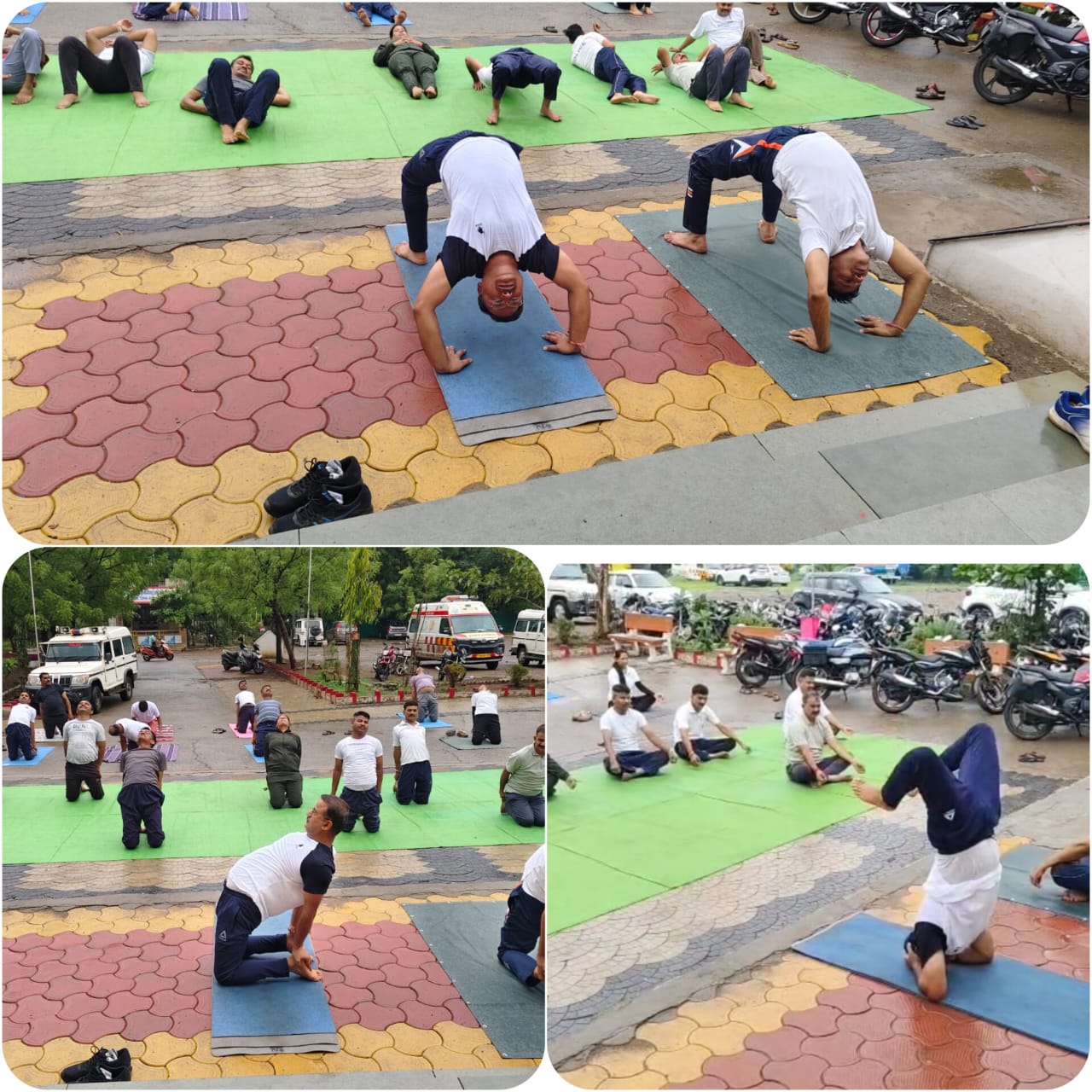 कुक्षी / Dig/एसपी श्री मनोज कुमार सिंह साहब ने जिले के समस्त थाना प्रभारियों एवं उनके स्टाफ को शारीरिक एवं मानसिक रूप से फिट रहने के लिए योगासन, प्राणायाम एवं कसरत करने के निर्देश दिए है जो टीआई राजेश यादव के द्वारा एएसपी श्री गीतेश गर्ग एवम एसडीओपी कुक्षी सुनील गुप्ता के मार्गदर्शन में योग दिवस पर फोर्स को चुस्त दुरुस्त बनाने के लिए थाना परिसर में समस्त स्टाफ को सूर्य नमस्कार,योगासन प्राणायाम के साथ ही फिजिकल एक्सरसाइज करवाई गई जिससे फोर्स शारीरिक मानसिक रूप से स्वस्थ रहें और अपनी ड्यूटी को मुस्तैदी से कर सके। टी आई राजेश यादव के द्वारा स्टाफ को सूर्य नमस्कार, सर्वांगासन, शीर्षासन, हलासन, धनुरासन, भुजंगासन चक्रासन वज्रासन सहित भ्रामरी प्राणायाम, अनुलोम विलोम भस्त्रिका प्राणायाम के साथ ही सम्मोहन की विधि बता कर बता कर चेतन और अवचेतन मन की शक्तियों से भी अवगत कराया जिससे फोर्स मानसिक और शारीरिक रूप से फिट रह सके।साथ ही स्टाफ को पुश अप लगवाकर हास्य योग भी करवाया। टी आई राजेश यादव ने बताया कि इस प्रकार की शारीरिक , यौगिक गतिविधियां,कसरत थाना कुक्षी में निरंतर जारी रहेगी। टी आई ने आम जनता से भी प्रतिदिन योग कर स्वस्थ्य रहने की अपील की है।