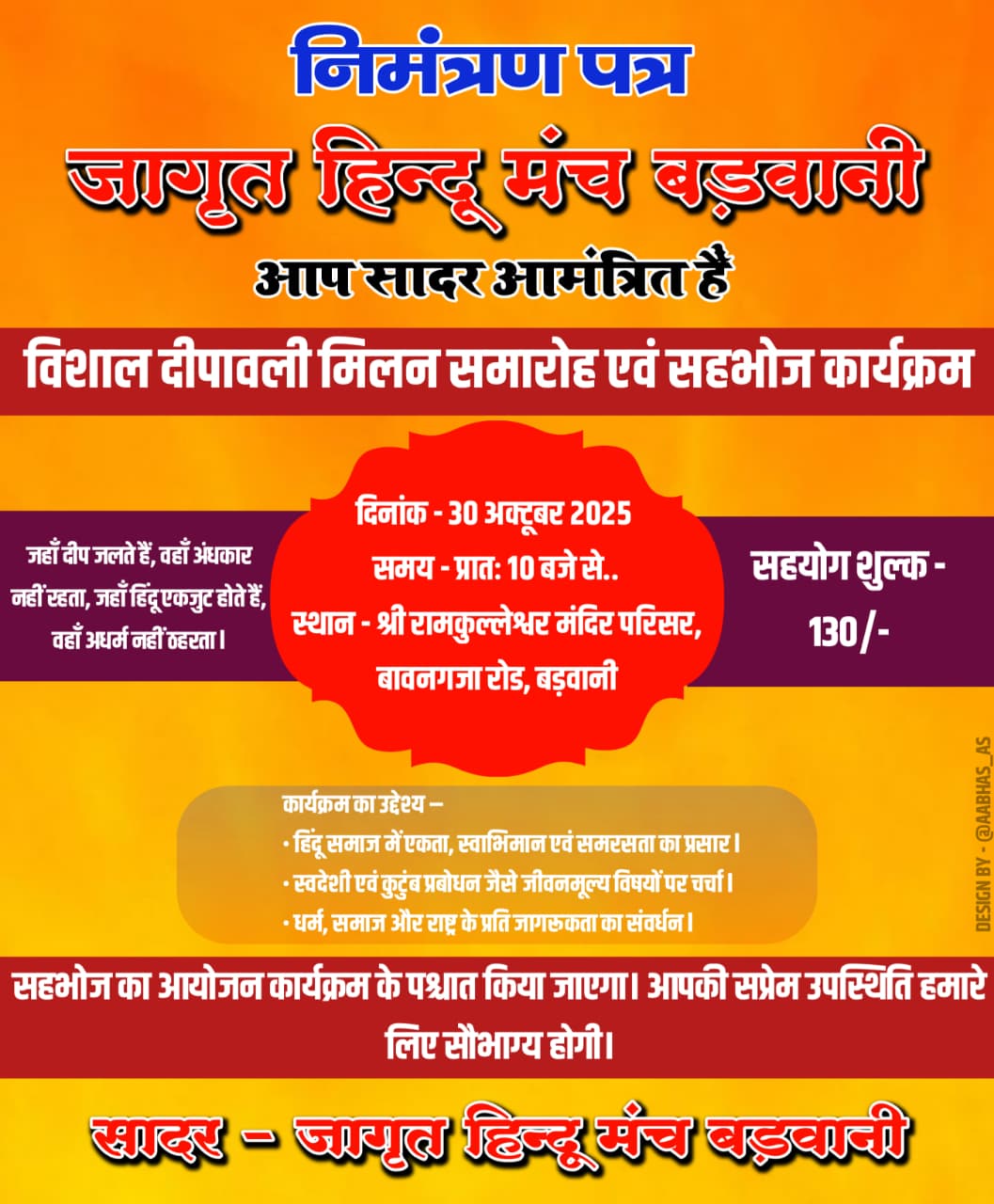 बड़वानी / जागृत हिंदू मंच, बड़वानी के तत्वावधान में कल गुरुवार, 30 अक्टूबर 2025 को रामकुल्लेश्वर मंदिर परिसर, बावनगजा रोड, बड़वानी में विशाल दीपावली मिलन समारोह एवं सहभोज कार्यक्रम का आयोजन किया जाएगा।