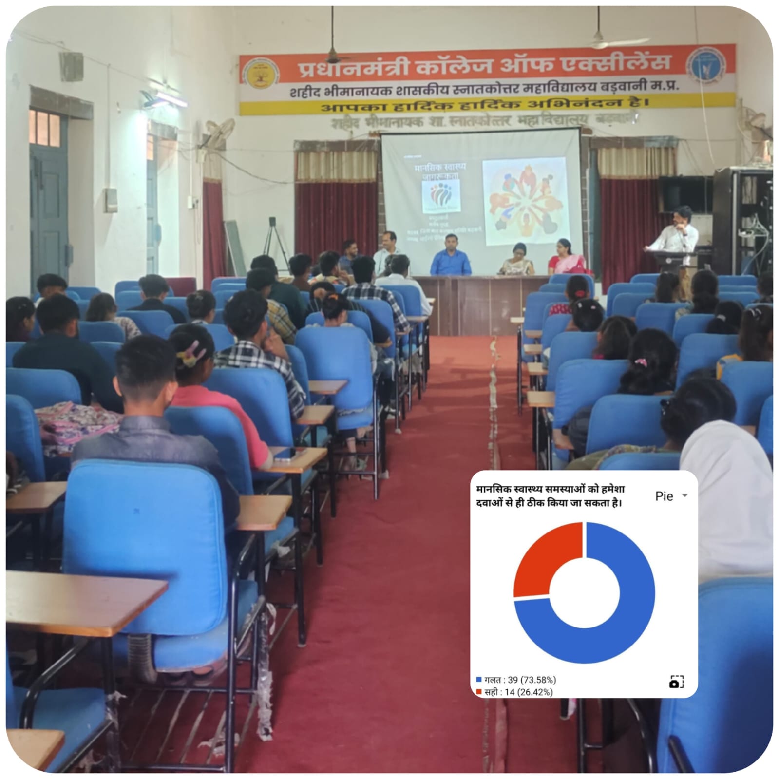 बड़वानी / प्रधानमंत्री कॉलेज ऑफ एक्सीलेंस में विद्यार्थियों के मानसिक स्वास्थ्य एवं कल्याण को केंद्र में रखते हुए एक प्रभावी कार्यशाला आयोजित की गई। कार्यक्रम माननीय सर्वोच्च न्यायालय के निर्देशों एवं उच्च शिक्षा विभाग, मध्यप्रदेश शासन के परिपालन में संपन्न हुआ। मुख्य वक्ता मनीष गुप्ता (अध्यक्ष, चाइल्ड इंडिया ट्रस्ट एवं सदस्य, बाल कल्याण समिति) ने कहा, “हम जितनी बातें मन में दबाकर रखते हैं, उतनी ही कुंठाएँ जन्म लेती हैं। मानसिक समस्याओं का उपचार उन्हें साझा करना है, न कि छुपाना।” उन्होंने विद्यार्थियों को मानसिक स्वास्थ्य के प्रति जागरूक एवं संवादशील बनने का संदेश दिया। महाविद्यालय की प्राचार्य डॉ वीणा सत्य के मार्गदर्शन एवं मानसिक स्वास्थ्य समिति के संयोजक डॉ जितेंद्र ठाकुर के निर्देशन में आयोजित इस कार्यक्रम की विशेषता लाइव डिजिटल सर्वेक्षण रहा। कार्यशाला के दौरान मानसिक स्वास्थ्य से जुड़े अनेक प्रश्न विद्यार्थियों से पूछे गए, जिनके माध्यम से उनकी समझ, भ्रांतियों एवं जागरूकता स्तर का आकलन किया गया। प्राप्त परिणामों के आधार पर विद्यार्थियों से तथ्यात्मक एवं विश्लेषणात्मक चर्चा की गई। एक प्रश्न — “क्या मानसिक स्वास्थ्य समस्याएँ केवल दवाओं से ही ठीक हो सकती हैं?” — पर 73.58% (39 प्रतिभागी) ने इसे गलत माना, जबकि 26.42% (14 प्रतिभागी) ने सही उत्तर दिया। इस परिणाम के आधार पर मुख्य वक्ता ने स्पष्ट किया कि मानसिक स्वास्थ्य का उपचार बहुआयामी है, जिसमें संवाद, परामर्श, पारिवारिक सहयोग, जीवनशैली सुधार एवं सकारात्मक सोच महत्वपूर्ण भूमिका निभाते हैं। कार्यक्रम में डॉ कंचन कन्नौजे, प्रो. लक्ष्मण डावर, प्रो. अनीता खांडे सहित प्राध्यापकगण एवं बड़ी संख्या में विद्यार्थी उपस्थित रहे। संचालन प्रो. अविनाश वानखेड़े, अतिथि परिचय प्रो. अर्चना पीपलाद तथा आभार प्रदर्शन प्रो. रितु कुमरावत द्वारा किया गया। कार्यशाला ने विद्यार्थियों में मानसिक स्वास्थ्य के प्रति वैज्ञानिक दृष्टिकोण एवं खुलकर संवाद की आवश्यकता को प्रभावी रूप से रेखांकित किया।