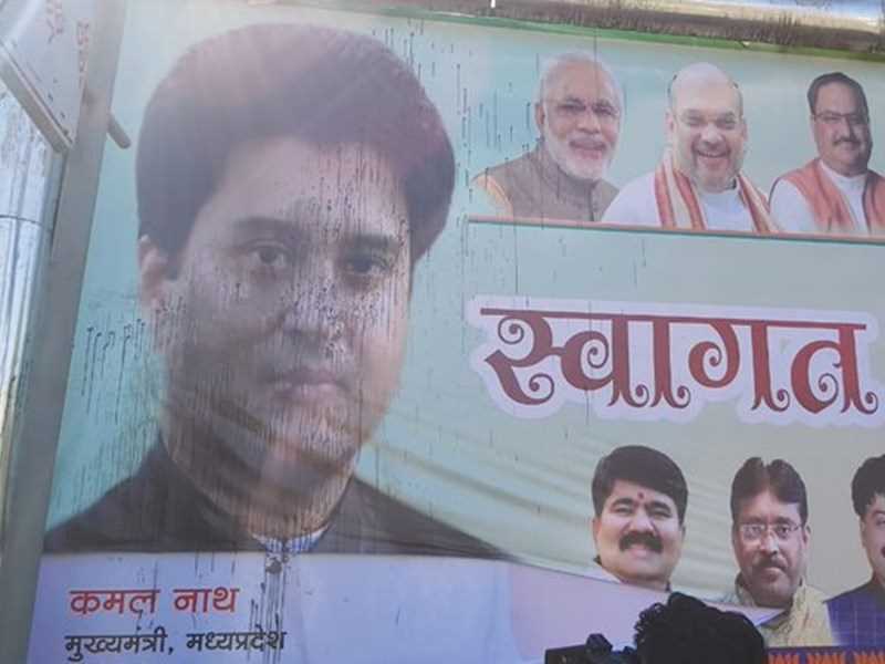 भाजपा में शामिल होने के बाद ज्योतिरादित्य सिंधिया आज दोपहर विमान से भोपाल पहुंचेंगे। भाजपा ने सिंधिया के स्वागत में भोपाल में जगह-जगह पोस्टर लगाए थे, इस दौरान कांग्रेस कार्यकर्ताओं ने पोस्टर में उनके चेहरे पर काला रंग डाल दिया। बताया जा रहा है कि सीएम कमलनाथ के पोस्टर के ऊपर यह पोस्टर लगाया गया था। इसे फाड़ने की कोशिश भी गई। भाजपा सिंधिया के स्वागत में भोपाल एयरपोर्ट से पार्टी कार्यालय तक रैली निकालेगी। उधर राज्यपाल लालजी टंडन आज 6 मंत्रियों को हटाने को लेकर फैसला ले सकते हैं, सीएम कमलनाथ ने ज्योतिरादित्य सिंधिया समर्थक मंत्रियों को हटाने के लिए पत्र लिखकर उनसे सिफारिश की थी। उधर बहुमत के दावों के बीच मध्य प्रदेश की कांग्रेस सरकार पर संकट गहराता जा रहा है। इंदौर से कांग्रेस विधायक जयपुर से अचानक इंदौर पहुंचे हैं। कांग्रेस ने अपने विधायकों को कल ही विशेष विमान से जयपुर भेजा था।