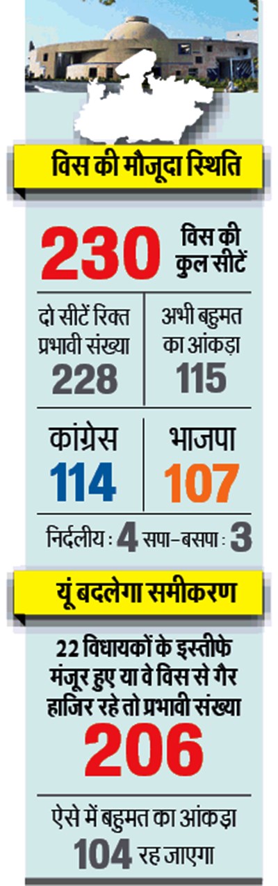 मुख्यमंत्री कमलनाथ समेत कांग्रेस के रणनीतिकारों का दावा है कि उनकी सरकार पूरी तरह सुरक्षित है और फ्लोर टेस्ट में वह एक बार फिर बहुमत साबित करने में कामयाब रहेगी। इसके बावजूद सरकार पर संकट के बादल और भी घने हो गए हैं। ज्योतिरादित्य सिंधिया के कांग्रेस छोड़ भाजपा का दामन थामने और छह मंत्रियों समेत 22 विधायकों के इस्तीफे के बाद बहुमत का आंकड़ा गड़बड़ा गया है। मंगलवार रात कांग्रेस विधायक दल की बैठक में मुख्यमंत्री ने अपने विधायकों को भरोसा दिलाया कि चिंता की बात नहीं है। सरकार को कुछ नहीं होगा। बुधवार को भोपाल से जयपुर जाते वक्त कांग्रेस के ज्यादातर मंत्री और विधायकों की भी यही राय थी, लेकिन आंकड़ों पर गौर करें तो हालात कुछ और ही नजर आते हैं।