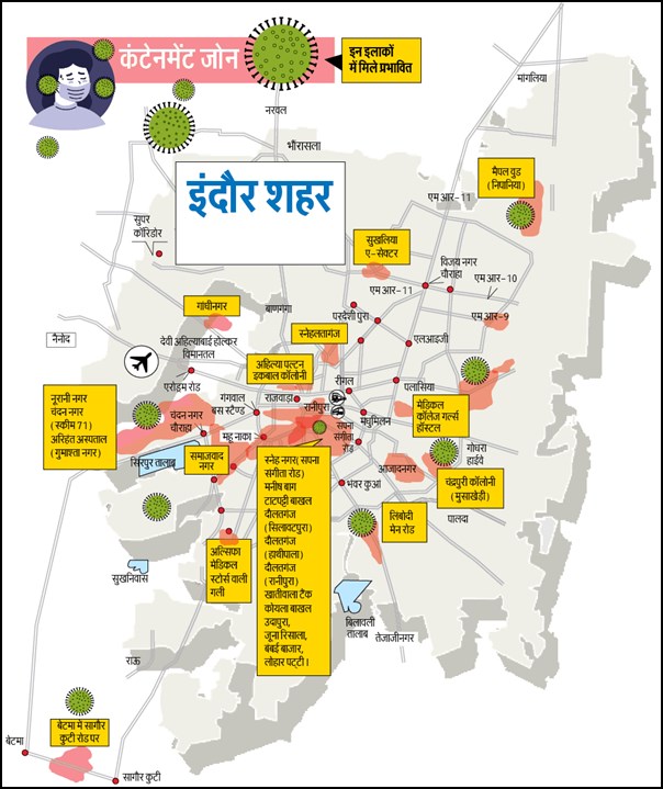 प्रशासन ने तय किया है कि इन इलाकों को मार्कर से चिन्हित किया जाएगा। इसके बाद इन्हीं एरिया में सर्वे किया जाएगा। ऐसा इसलिए किया जाएगा कि कुछ इलाकों में इतनी सघन आबादी है कि वहां 3 किलोमीटर के दायरे में हर घर का सर्वे करने में काफी वक्त लगेगा। इसलिए सर्वे में उन्हीं घरों को शामिल किया जाएगा, जो प्रभावित घर से नजदीकी रूप से जुड़े हैं। नए कंटेन्मेंट जोन के रूप में एरोड्रम रोड पर अंबिकापुरी कॉलोनी, गांधीनगर, मोतीतबेला, स्नेहलतागंज, उदापुरा, इकबाल कॉलोनी, चंदन नगर की गली नंबर-11, सुखलिया ए-सेक्टर, समाजवाद नगर, मेडिकल कॉलेज गर्ल्स हॉस्टल के अलावा बेटमा में सागौर कुटी रोड पर अल्सिफा मेडिकल स्टोर्स वाली गली को शामिल किया गया है। इस तरह देखा जाए तो कोरोना वायरस का फैलाव शहर से दूर बेटमा तक भी हो चुका है। कोराना वायरस का नए इलाकों में पाया जाना इस बात का संकेत है कि अब यह शहर में तेजी से पैर पसार सकता है।