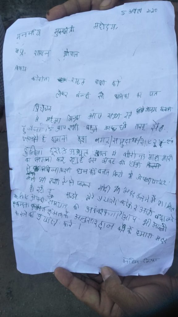 कक्षा पहली में पढ़ने वाली महिमा मिश्रा ने मध्य प्रदेश के मुख्यमंत्री शिवराज सिंह चौहान के नाम पत्र लिखते हुए कहा मुख्यमंत्री जी कोरोना महामारी को लेकर हम सभी आपके साथ हैं
