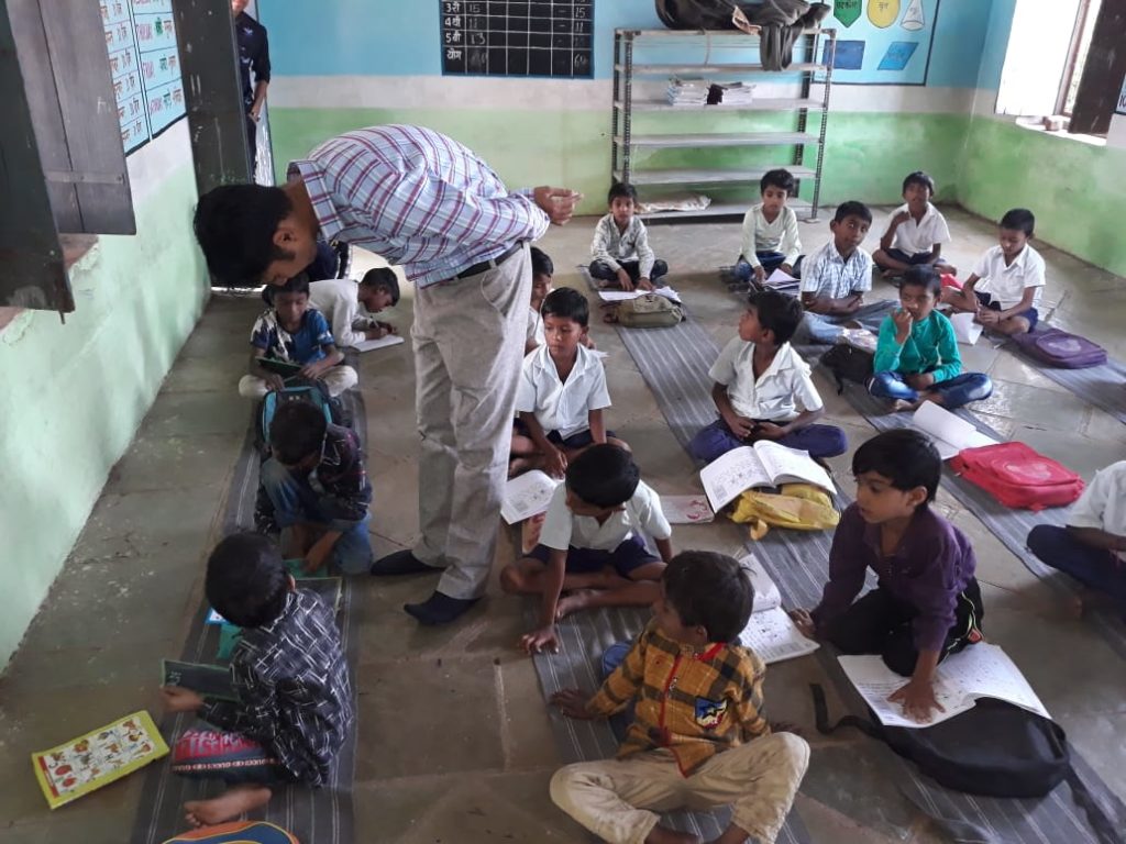 जमीन पर बच्चों के साथ बैठकर ली अक्षर ज्ञान की जानाकरी