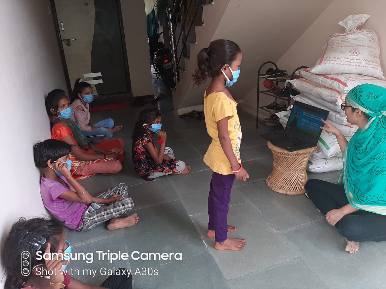 साथ ही उन्हें सोशल डिस्टेंस के साथ हाथ धुलाई और कोरोना वायरस से जागरूकता संबंधित वीडियो दिखाकर बचाव के उपाय बता रही है साथ ही उन्हें हाथ से बने मास्क बाँटे गए। साथ ही दो गज की दूरी का पालन करवाया गया।किशोर बालिकाओं को बारिश के मौसम में कौन कौन सी सावधानी रखना है इस बारे मे समझाया गया शिवानी एज्यकेट गर्ल की टीम बालिका का कर्तव्य भी निभा रही है बच्चों को लेपटाप पर विडियो दिखाकर जागरूक कर रही है बच्चों को सुखी खाघान्न सामग्री भी वितरित की ।