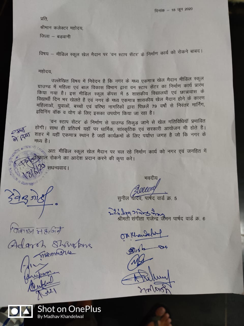 बड़वानी/ शहर के मध्य एकमात्र खेल मैदान मीडिल स्कूल ग्राउण्ड में महिला एवं बाल विकास विभाग के व्दारा ‘वन स्टाप सेंटर’ का निर्माण कार्य किया जा रहा है। इस निर्माण कार्य को तत्काल रोकने की मांग पार्षद सहित गणमान्य नागरिकों के व्दारा की गई है। इस सम्बन्ध में लिखित आवेदन कलेक्टर बड़वानी को सौपा गया है। आवेदन में यह उल्लेखित किया गया है कि इस मीडिल स्कूल केंपस में 5 शासकीय विधालयों एवं छात्रावास के विधार्थी दिन भर खेलते है। शहर का एकमात्र शासकीय खेल मैदान होने के कारण महिलाओं, युवाओं, बच्चों एवं वरिष्ठ नागरिकों व्दारा पिछले 79 वर्षो से निरन्तर मार्निंग, इवनिंग वाॅक व योग के लिए इसका उपयोग किया जा रहा है। ‘वन स्टाप सेंटर’ के निर्माण से ग्राउण्ड सिकुड़ जाने से खेल गतिविधियाॅं प्रीाावित होगी। साथ ही प्रतिवर्ष यहाॅं पर धार्मिक, सांस्कृतिक एवं सरकारी आयोजन भी होते है। शहर में यही एकमात्र स्थान है जहाॅं कार्यक्रमों के लिए पर्याप्त जगह है जो कि शहर के मध्य है। 18 जून 2020 को दिये गये आवेदन में उक्त कार्य को शहर व जनहित में तत्काल रोके जाने की मांग की है।