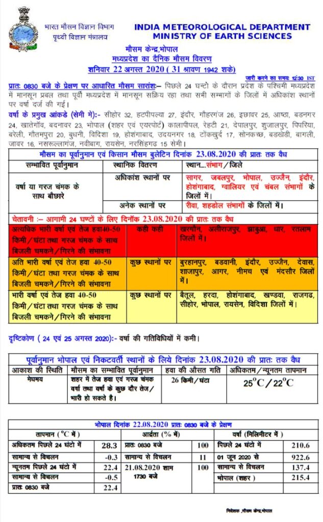 भोपाल । मौसम विभाग नागपुर की आधिकारिक वेबसाइट पर जारी रिपोर्ट के अनुसार मध्य प्रदेश के पांच जिलों रतलाम, धार, झाबुआ, आलीराजपुर और खरगोन में भारी बारिश का रेड अलर्ट जारी किया गया है। मौसम विभाग के अनुसार 24 घंटे में 204.5 मिमी से ज्यादा बारिश की आशंका पर रेड अलर्ट जारी किया जाता है। वहीं 9 जिलों मंदसौर, नीमच, आगर, शाजापुर, देवास, उज्जैन, इंदौर, बड़वानी, और बुरहानपुर में अति भारी बारिश की चेतावनी जारी की गई है। उधर, विदिशा, रायसेन, भोपाल, सीहोर, राजगढ़, खंडवा, होशंगाबाद, हरदा और बैतूल में कुछ स्थानों पर बारिश हो सकती है।