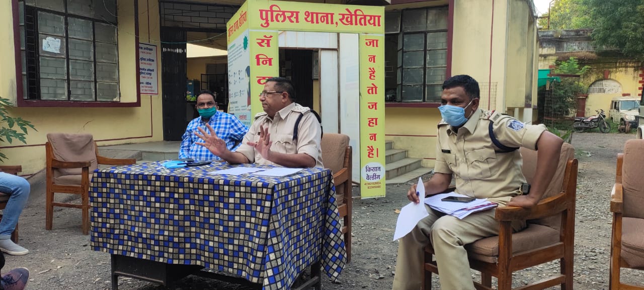 खेतिया / पुलिस थाना परिसर खेतिया पर आज शांति समिति की बैठक आयोजित की गई बैठक में SDOP पदमसिंग बघेल ने  केंद्रीय सरकार, प्रदेश सरकार व कलेक्टर बड़वानी के प्रशासन के दिशा निर्देशों के संबंध में उपस्थित नागरिकों से चर्चा की गई ।शासन के आदेश अनुसार आगामी त्यौहारों पर स्थापित की जाने वाली प्रतिमाओं की ऊंचाई पर प्रतिबंध समाप्त कर दिया गया है, पांडाल का आकार अधिकतम 30×45 नियत किया गया है। प्रतिमा स्थापना स्थल पर भीड़ नहीं हो सोशल डिस्टेंसिंग का पालन हो इसकी व्यवस्था आयोजकों को करनी होगी। मूर्ति विसर्जन, मूर्ति स्थापना के संबंध में अनुविभागीय अधिकारी द्वारा अनुमति प्राप्त करना आवश्यक होगा ।कोरोना संक्रमण को दृष्टिगत रखते हुए कोई भी चल समारोह निकालने की अनुमति नहीं होगी साथ ही गरबा आयोजन नहीं हो सकेंगे ध्वनि विस्तारक यंत्रों के संबंध में माननीय सर्वोच्च न्यायालय की गाइडलाइन का पालन करना अनिवार्य होगा।