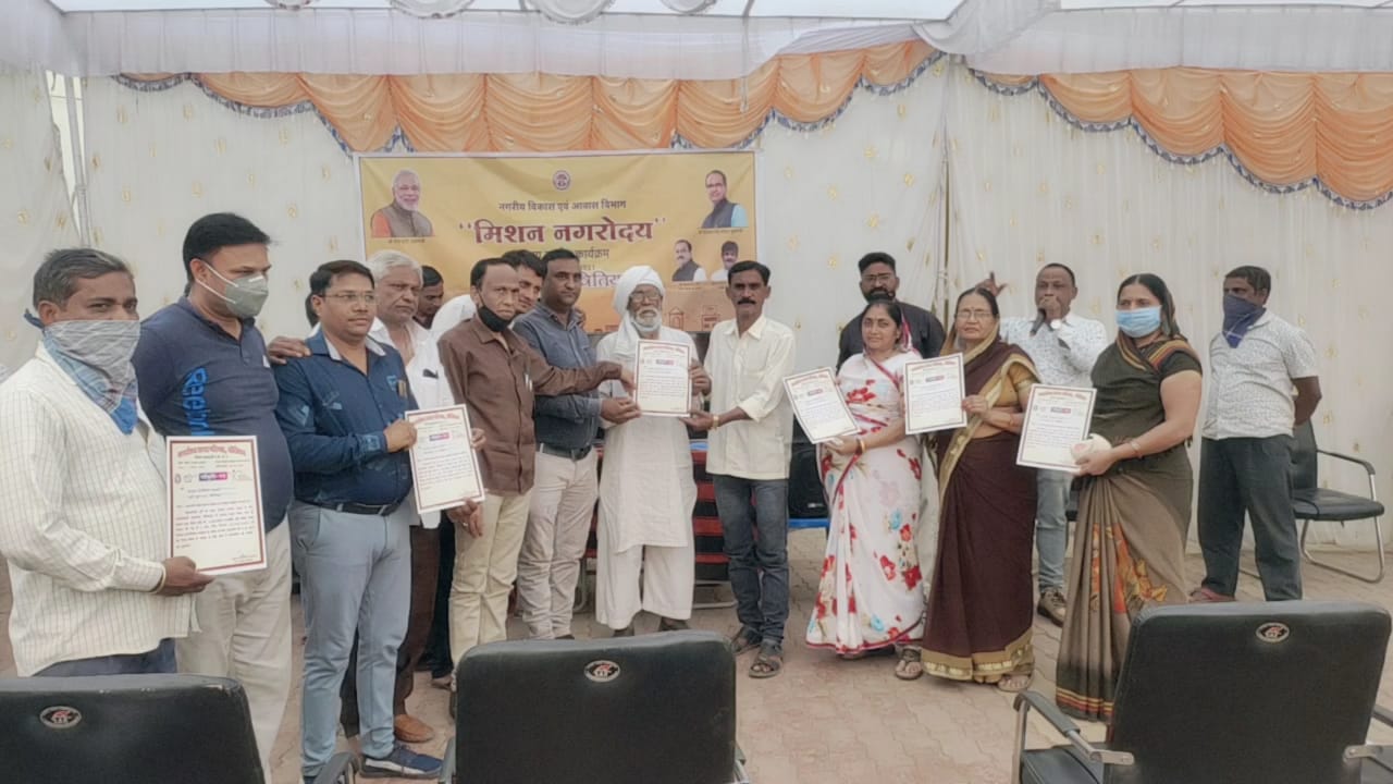 खेतिया(सुभाष सोनिस) मध्य प्रदेश शासन के निर्देशानुसार  दिनांक 12:03 2021 को मिशन नागौर उदय एवं आजादी की अमृत महोत्सव कार्यक्रम का आयोजन नगर परिषद खेतिया अध्यक्ष श्रीमती चंदनबाई अरविंद जी बागुल की अध्यक्षता में तथा पार्षदों के विशेष आतिथ्य में संपन्न  हुआ उक्त जानकारी देते हुए मुख्य नगरपालिका अधिकारी  यशवंत शुक्ला ने बताया कि नगर परिषद खेतिया द्वारा शासन की मंशा अनुसार मिशन नगर उदय का शुभारंभ किया गया जिसमें प्रधानमंत्री आवास योजना के अंतर्गत 202 हितग्राहियों के खाते में प्रथम एवं द्वितीय किस्त की राशि ₹100000 का   स्वीकृति  पत्र प्रदान किए गए कार्यक्रम में सर्वप्रथम आजादी का अमृत महोत्सव अंतर्गत महात्मा गांधी जी सरदार वल्लभ भाई पटेल जी नेताजी सुभाष चंद्र बोस के चित्र पर पर माल्यार्पण किया गया कार्यक्रम को अतिरिक्त तहसीलदार  हुकुम सिंह निगवाल तथा पार्षद प्रतिनिधि  मदन लाल जैन ने संबोधित किया मध्य प्रदेश के माननीय मुख्यमंत्री शिवराज सिंह जी चौहान का संबोधन उपस्थित हितग्राहियों को तथा नगर के गणमान्य नागरिकों को सुनाया गया  कार्यक्रम के अंत में सभी 202 हितग्राहियों के के खातों में ₹100000 राशि के स्वीकृति पत्र वितरित किए गए इस अवसर पर अनुभाग अधिकारी राजस्व पानसेमल श्री सुमेर सिंह जी मुजाल्दा पार्षद श्रीमती शोभा बाई सुर्यकांत जी येसिकर श्रीमती उमा बेन उद्धव जी पटेल अनिल भगवान  चौधरी राकेश सुदाम चौधरी सुरेश जगन  चौहान पार्षद प्रतिनिधि धनराज चौधरी  एवं निकाय के लेखापाल ईश्वर महाले कार्यक्रम के प्रभारी उपयंत्री राजु डावर उपयंत्री अशोक शर्मा सहित समस्त अधिकारी कर्मचारी गण तथा नगर के गणमान्य नागरिक गण उपस्थित थे