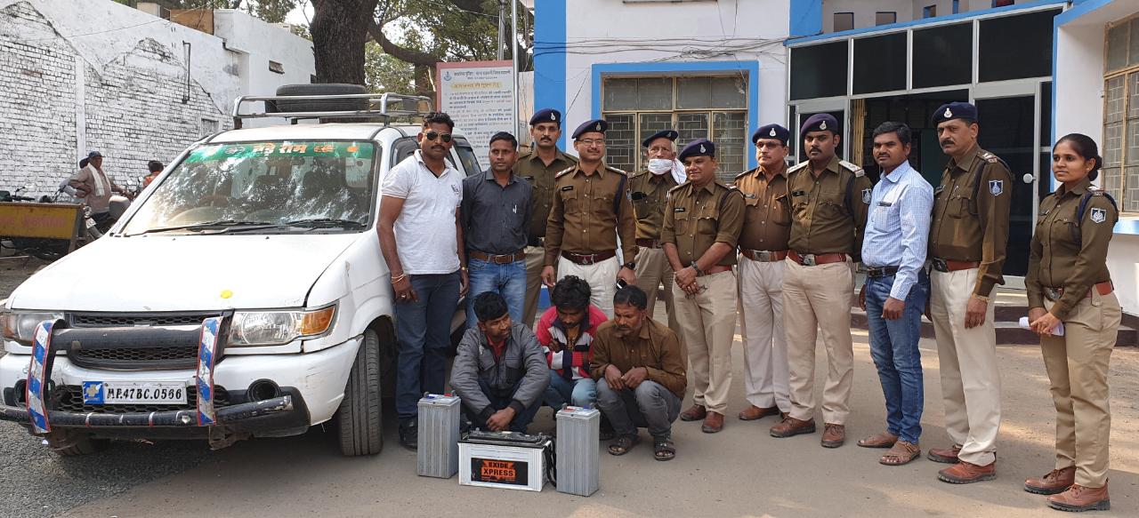 बड़वानी/ शहर में लगातार बढ़ रही मोटर सायकल चोरी की घटनाओं को एसपी बड़वानी डीआर तेनीवार ने गंभीरता से लेते हुये स्वयं के निर्देशन एवं एएसपी सुनीता रावत, एसडीओपी अंतरसिंह जमरा के मार्गदर्शन एवं टीआई बड़वानी राजेश यादव के नेतृत्व में उनि विजय रावत, सउनि आरके लौवंशी, आर.बलवीर, आर.अंतरसिंह, आर.सुरेन्द्र, आर.गेंदालाल, आर. नत्थूसिंह, आर.जितेन्द्र. आर. जगजोतसिंह आर.महेन्द्र, आर.योगेश्वर तथा 100 डायल टीम गठित कि। ज्ञात हो कि दिनांक 04.05.12.19 की रात्रि में छोटी कसरावद गाँव में भारती अल्फाट्रेक मोबाईल कम्पनी के मेजर हरिओम तिवारी द्वारा रिपोर्ट किया कि अज्ञात बदमाशों द्वारा टावर का मेन दरवाजा तोड़कर उसमे लगी बैटरिया चुराकर ले गये। सुचना पर थाना बड़वानी पर अपराधक 773/19 धारा 457,380 भादवि का कायम कर विवेचना में लिया गया। विवेचना में घटना के बाद लगातार अज्ञात आरोपी एवं घटना में युक्त टवेरा वाहन की तलाश पतारासी कि गई जिसमें दिनांक 10.12.19 को जिला खरगोन के ग्राम बडुद से आरोपी हेमेन्द्र पिता कालुराम वर्मा जाति कहार उम्र 24 वर्ष निवासी ग्राम बडुद थाना सनावद जिला खरगोन,ं प्रेमसिंग पिता बागसिग जाति भीलाल उम्र 35 वर्ष निवासी बडुद एवं जामसिंग पिता राजाराम डाबर जाति भीलाला उम्र 46 वर्ष ग्राम जुनापानी थाना सनावद क्षेत्र से गिरफ्तार किया आरोपीगणों से घटना मे उपयुक्त मे लाई गई टवेरा वाहन क एम.पी. 47 बी.सी. 0566 एवं टावर से चोरी गई बैटरियां आदि सामग्री बरामद की गई है। पुलिस पूछताछ में आरोपियों ने अन्य क्षेत्रों से भी की गई चोरी की घटनाओं को कबूला कि कई थाना क्षेत्रों में टावर में लगी बैटरियों को चुराई है तथा गुजरात छोटा उदयपुर से बोलेरो वाहन भी चुराया है आरोपीगणों के विरुद्ध छोटा उदयपुर में बुलेरो गाड़ी का चोरी का प्रकरण में फरार चल रहे है तथा हार्ट पीपलिया से बैटरी चोरी तथा चांदपुर जिला अलीराजपरु से बैटरिया चोरी तथा सनावद में सरीया चोरी के प्रकरणतथा धनगांव जिला खण्डवा ड्रीप लाईन चोरी के मामले में तथा थाना छिप्रा देवास के अन्तर्गत ट्रक के अन्दर के सामान चोरी के प्रकरण न्यायालय में विाराधीन चल रहे है। टीम की इस सफलता पर पुलिस अधीक्षक श्री तेेनीवार ने बधाई देते हुुऐ पुरस्कृत करने की घोषण की।
